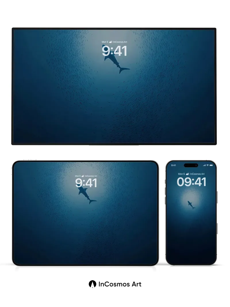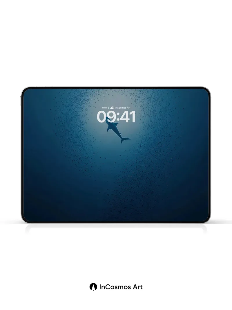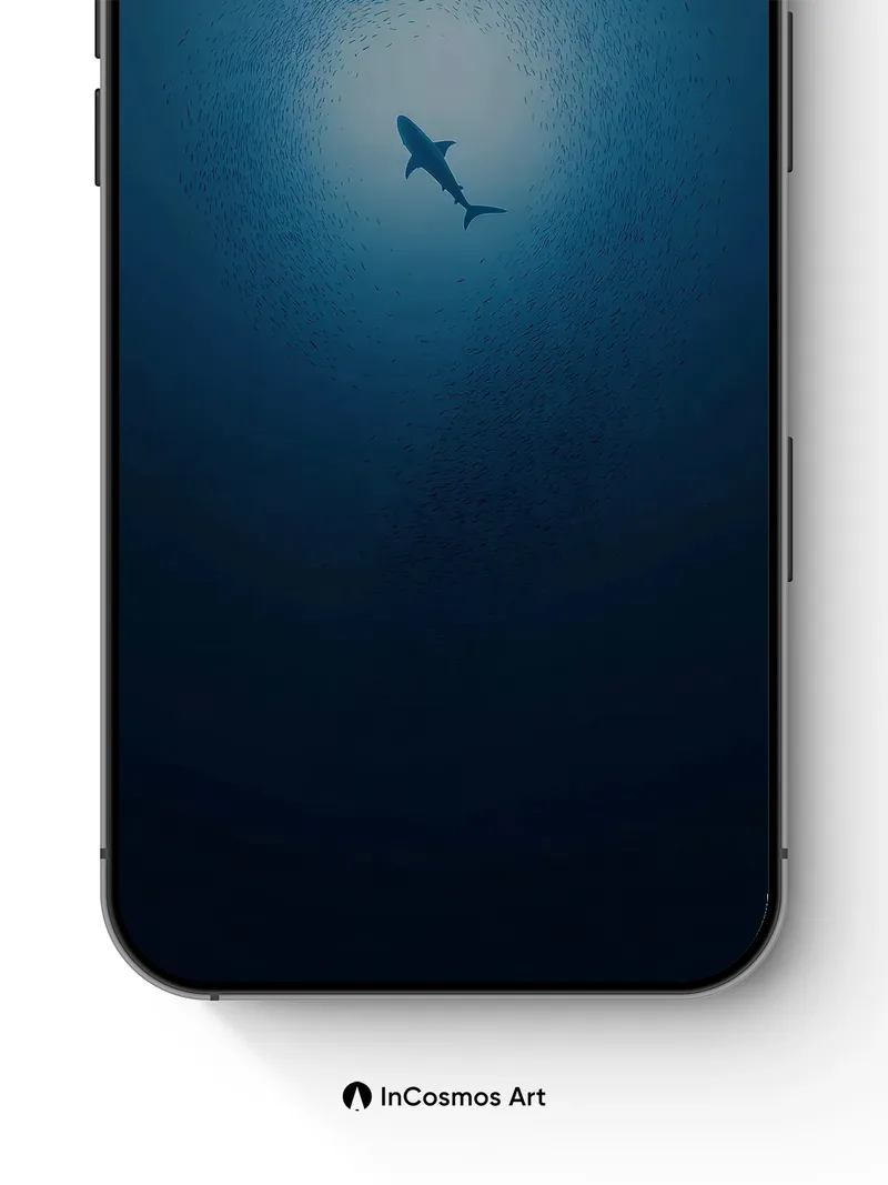 The water is a heavy, blue velvet curtain, parted only by the sharp, dark cut of a shark gliding toward the light. Did you know sharks have no bones, only cartilage? It makes them feel less like animals and more like living shadows in this deep, silent theater. Share this with your best friend. Send this to your love and swap a matching set. Have you ever felt that kind of quiet pressure? The full resolution of this artwork/wallpaper is 4320 × 7708, with a file size of 1.99 MB MB. Image in App code: pg8296 1080:1927 Applicable to mobile phones. This product only contains one wallpaper, other wallpapers in the multi-device effect preview need to be purchased separately. Download Information The download link will be on the “Thank You” page once payment is completed. Most wallpaper themes can be instantly downloaded once payment is processed. Few wallpaper backgrounds will generally be processed and sent within 48 hours to your email inbox as our team must confirm that patterns, quality, and links are in proper working order before shipping.
