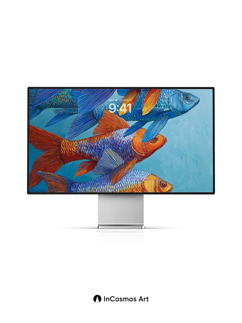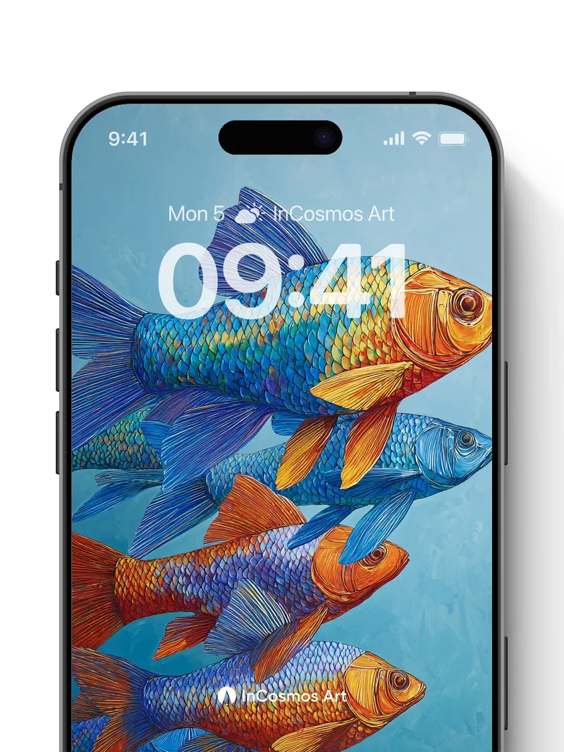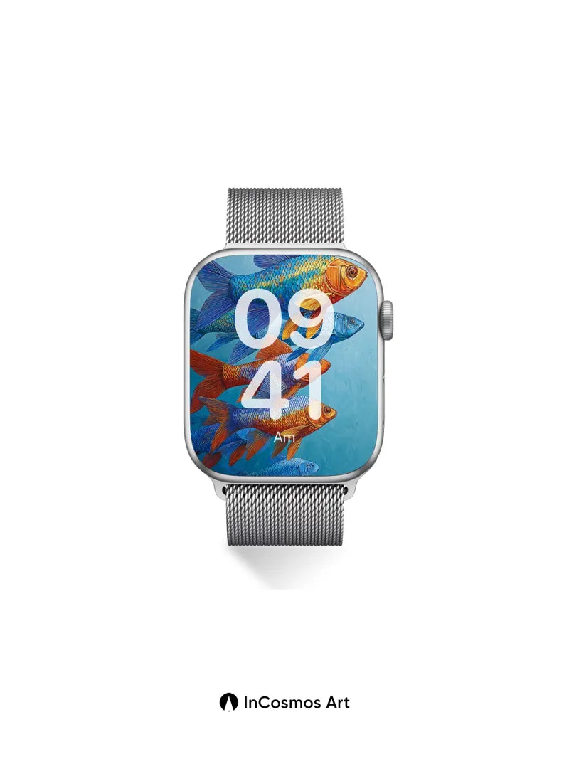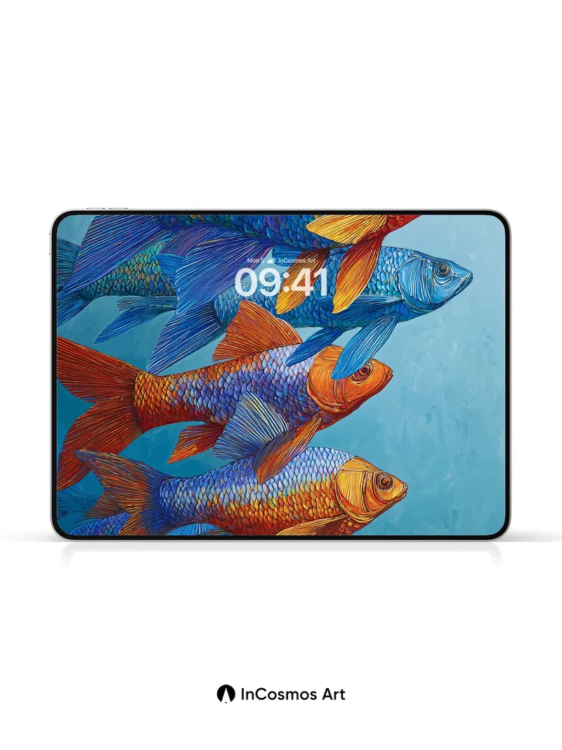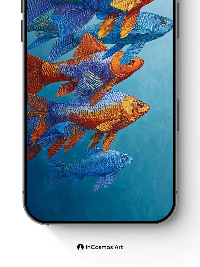 Debug page_description: Did you know fish scales can reflect light like tiny mirrors, shifting color with every angle? These iridescent swimmers glide through a deep turquoise haze, their bodies shimmering with electric blues, molten oranges, and golden flecks that seem to breathe beneath the surface. You feel the water’s cool whisper as they dart in silent formation, each fin a brushstroke of motion. Share this with your best friend. Send this to your love and swap a matching set. What if your walls could swim?
