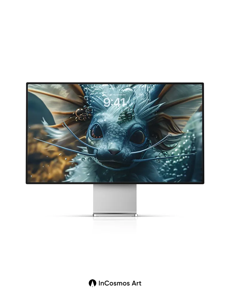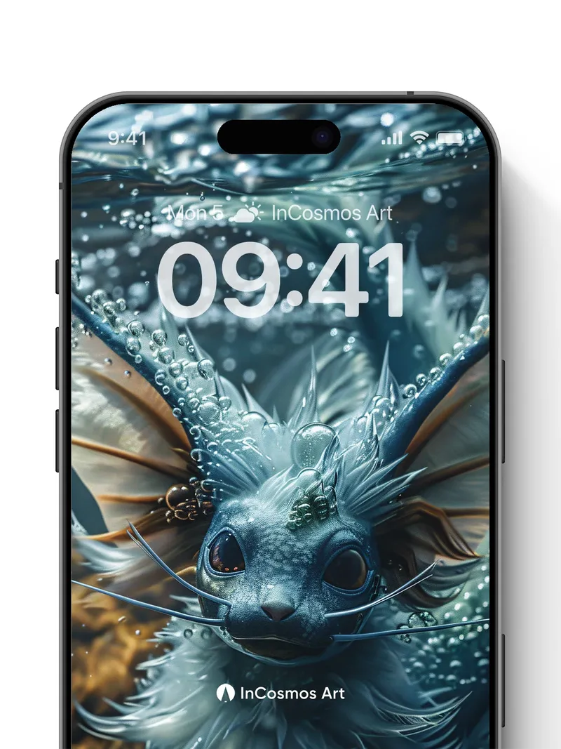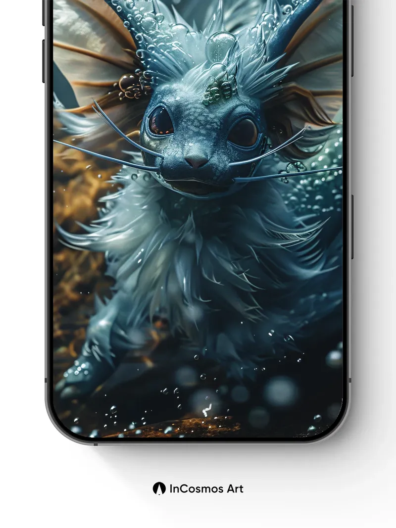 Debug product.metafields.custom.desc: Did you know water droplets refract light like tiny prisms, turning a creature’s gaze into a constellation of reflections? This ethereal being floats beneath the surface, its silver fur shimmering like frost on glass, each bubble clinging to its horned head like pearls in motion. The eyes hold ancient stillness, yet the current tugs at its whiskers, whispering secrets from deep below.