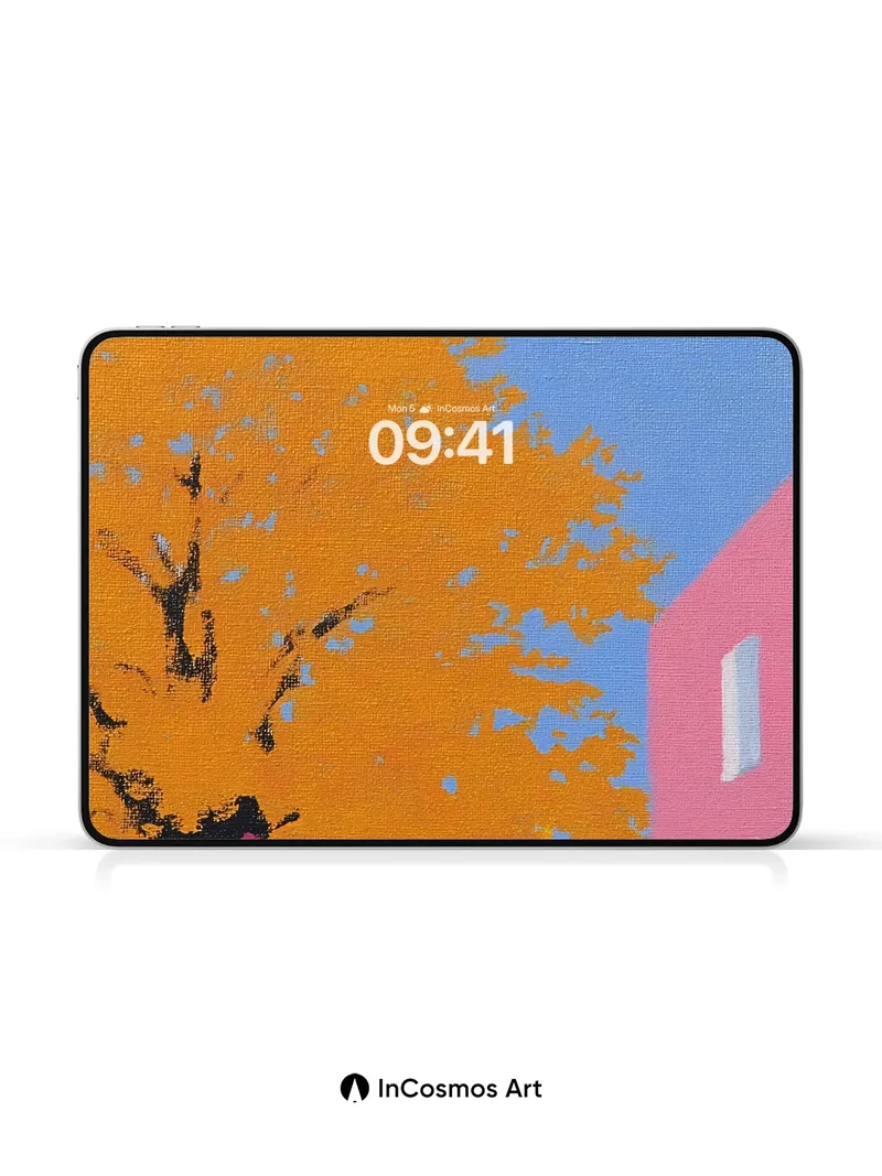 Debug product.metafields.custom.desc: Did you know that the color orange in autumn leaves comes from carotenoids, pigments that remain visible when chlorophyll fades? This vibrant tree stands like a living flame against a sky of quiet cerulean, its branches etched in shadow as if painted by hand. Beside it, a pink building leans into the frame—its clean lines and flat planes echoing the precision of modernist design, while the ground glows with a soft blush, as though light itself has been filtered through silk.
