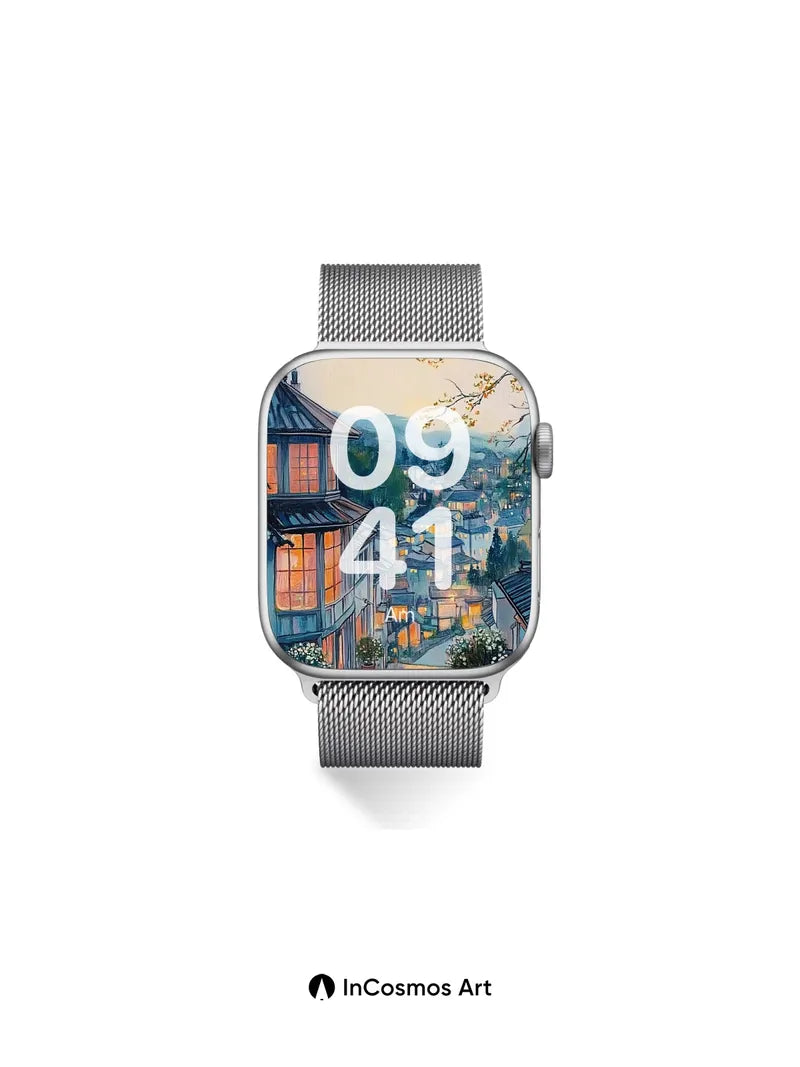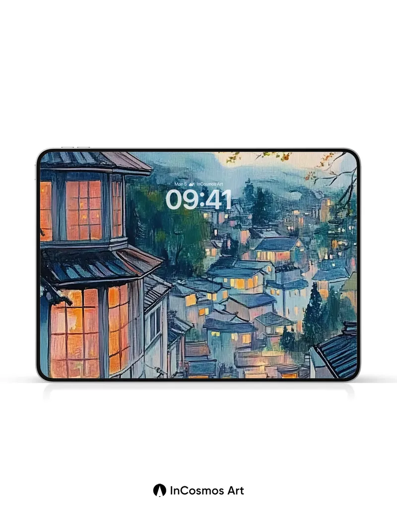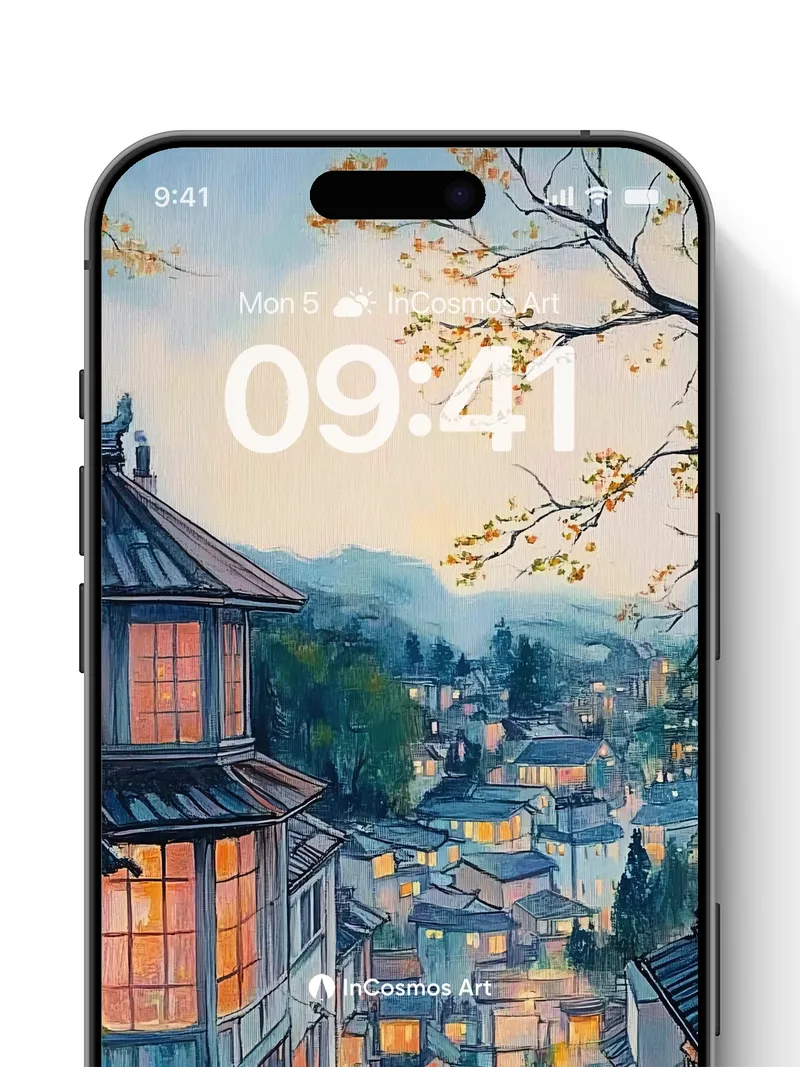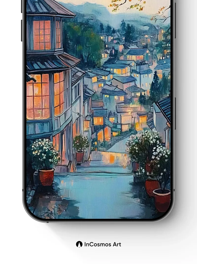 Debug product.metafields.custom.desc: Did you know that in ancient Japanese towns, lanterns were lit at dusk to guide spirits home? Warm light spills from paper windows, crawling over wooden beams like honey in twilight, while cherry branches drape overhead in amber and gold. The quiet alley reflects the sky’s soft blush, and potted blossoms stand guard like silent witnesses to time’s gentle passage.