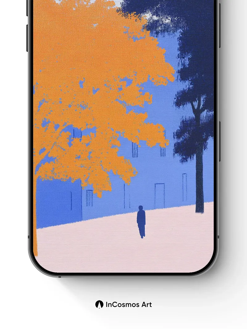 Debug product.metafields.custom.desc: Did you know the color of autumn leaves comes from chlorophyll fading, revealing hidden pigments beneath? A lone figure walks beneath a golden tree that breathes warmth into the cool blue air, its branches like fingers reaching through a hushed sky. The ground glows faintly, as if lit from within, while shadows stretch long and quiet—this is not just a scene, but a pause in time.
