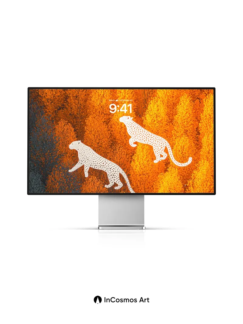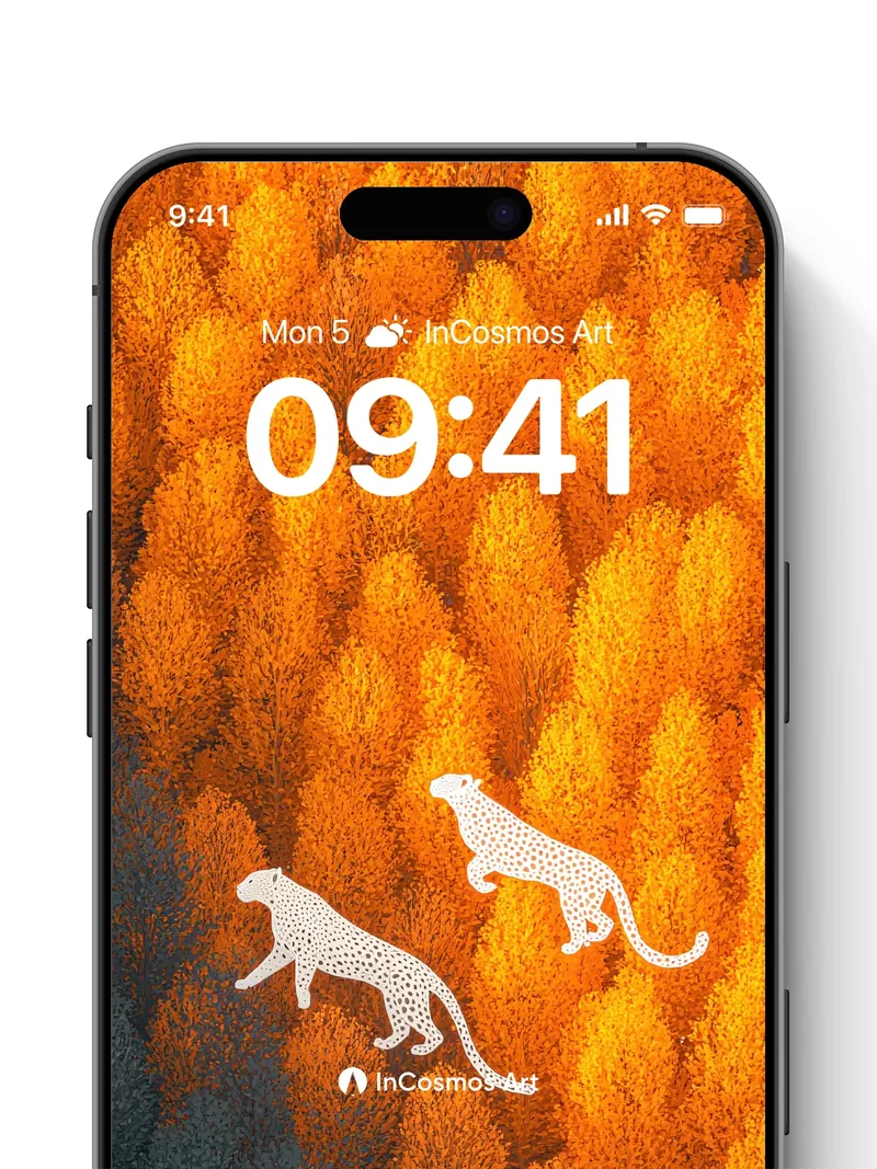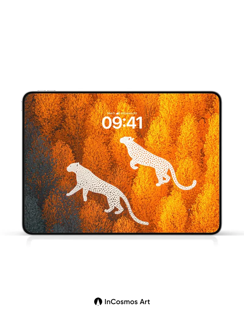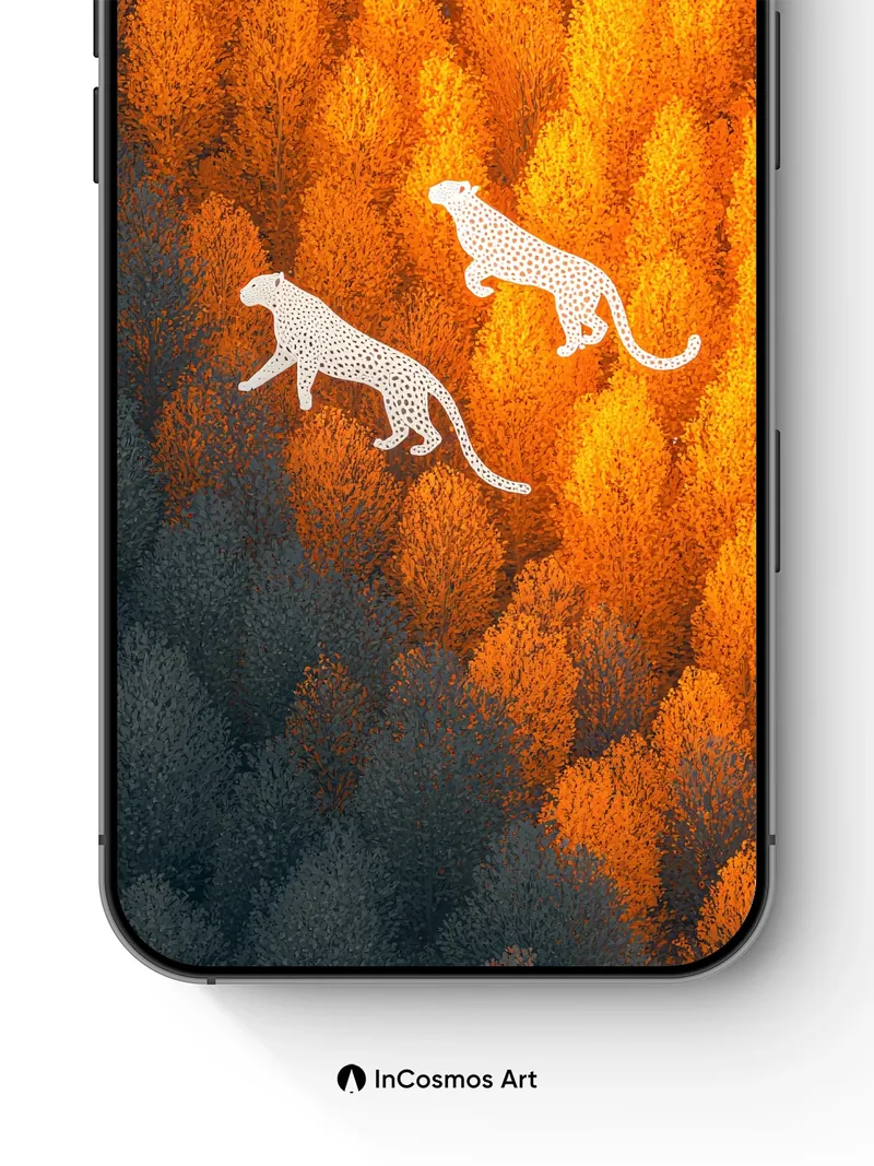 Debug product.metafields.custom.desc: Did you know that leopards can move silently through forests, their spotted coats blending into dappled light? Here, two spectral felines glide over a sea of fiery treetops, where golden leaves shimmer like molten glass under an unseen sun. The forest breathes in waves of amber and rust, each tree a candle lit from within, while the animals seem to exist just beyond touch—ethereal, poised, and wild.