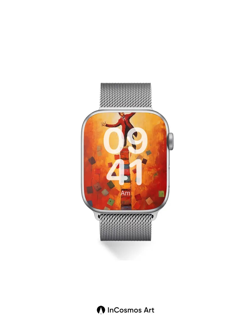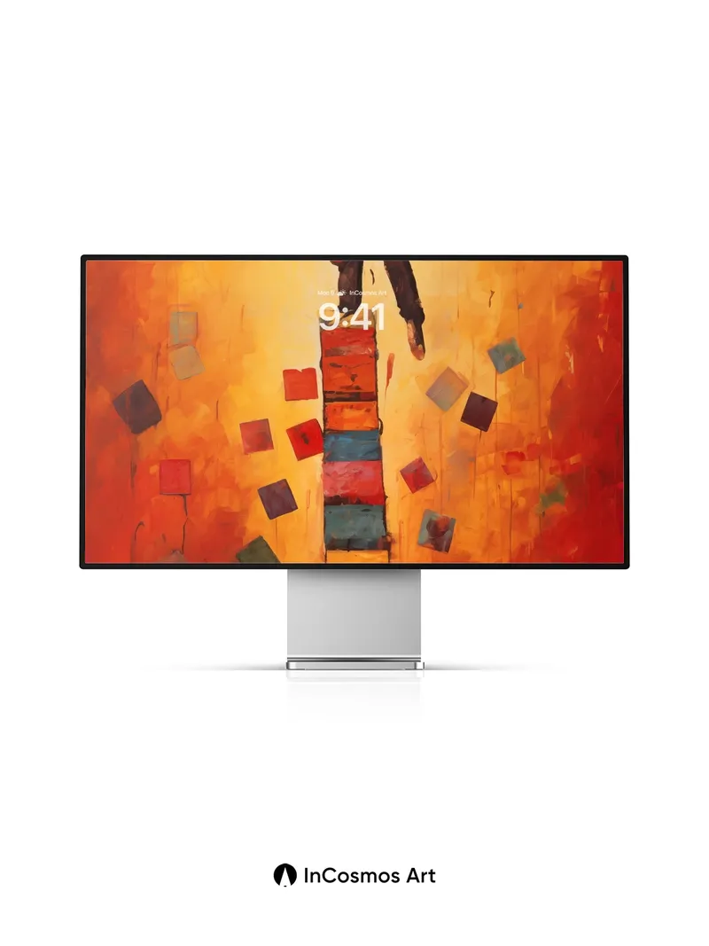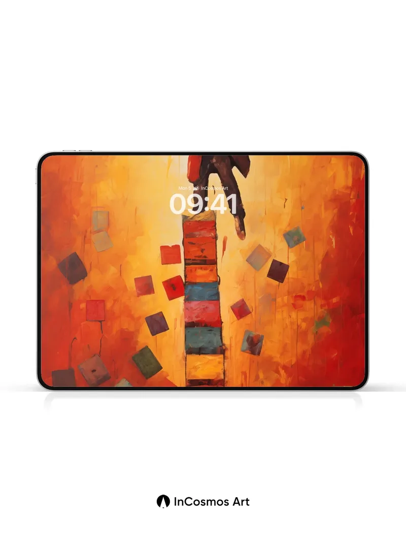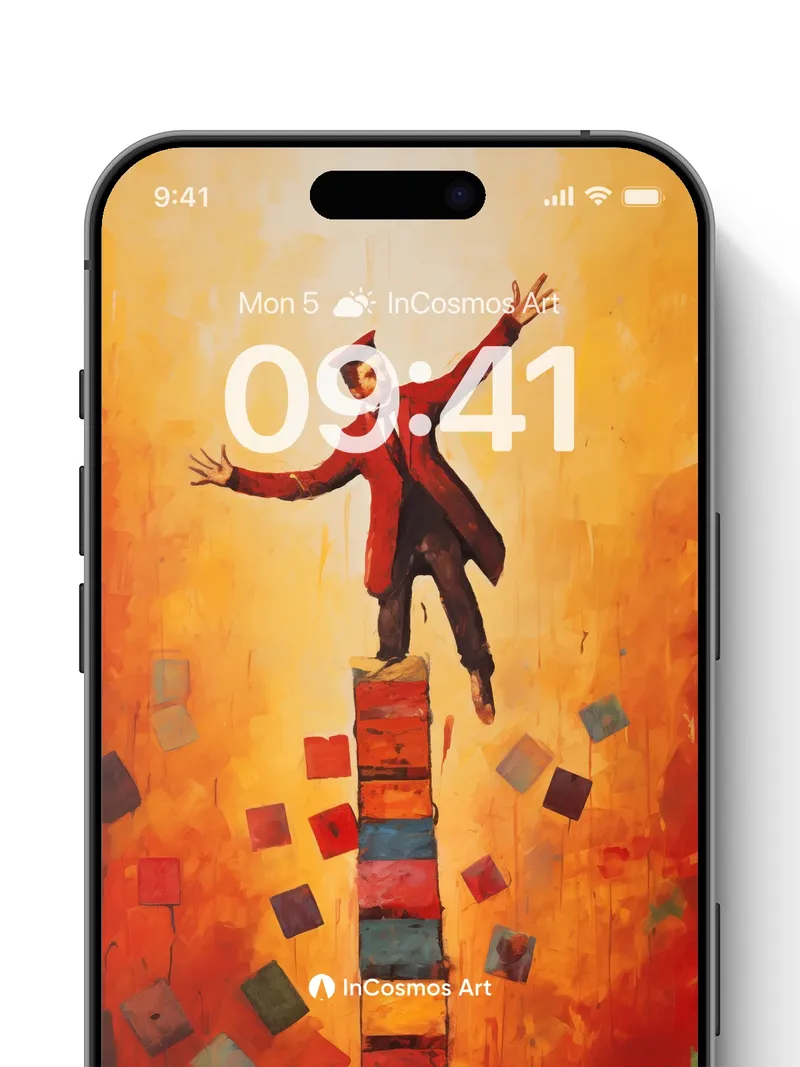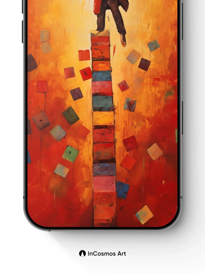 Debug product.metafields.custom.desc: Did you know that in the 19th century, circus performers used colored blocks as props to symbolize life’s fragile equilibrium? Here, a man in a red coat stands atop a towering stack of vibrant, mismatched blocks, arms outstretched like wings against a fiery sky. Around him, squares drift like confetti caught in an invisible breeze, each one a fragment of memory or choice. The paint bleeds and swirls like molten gold, turning the background into a living flame.