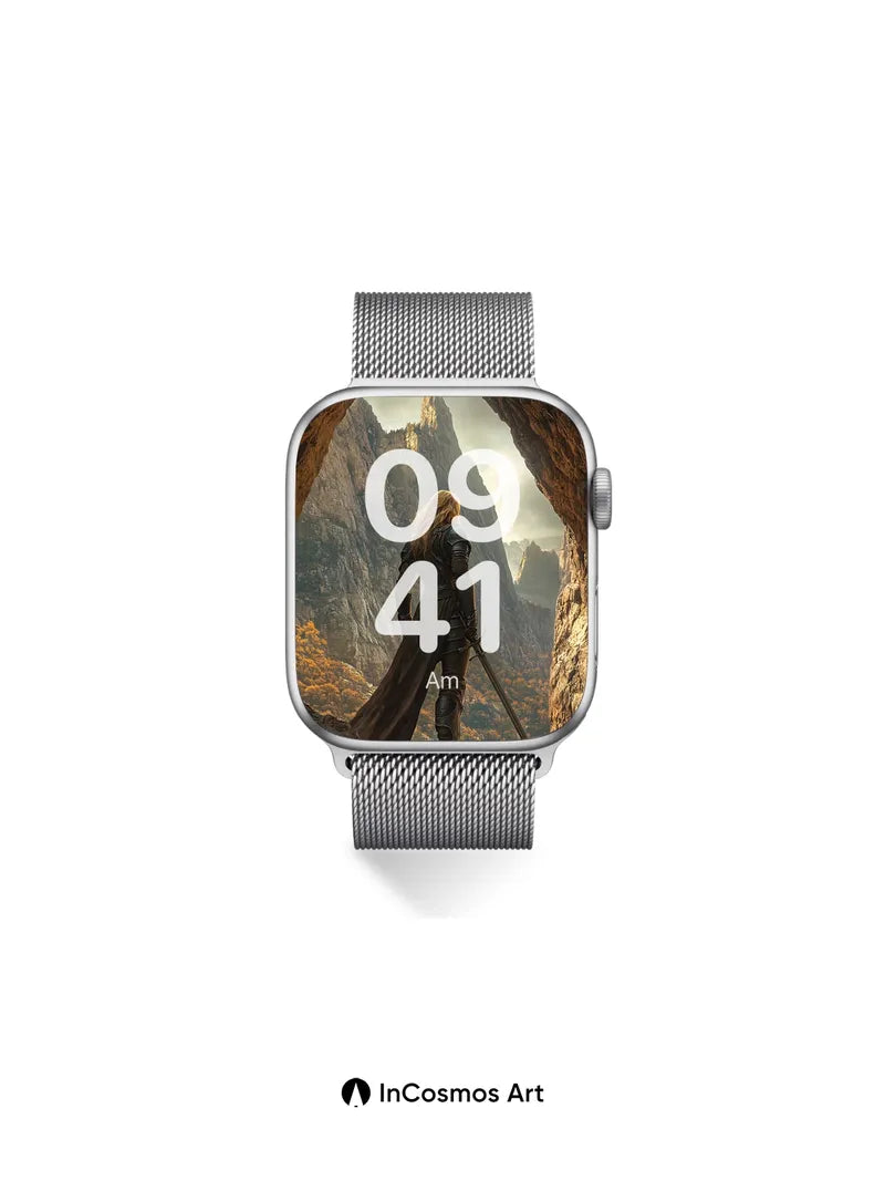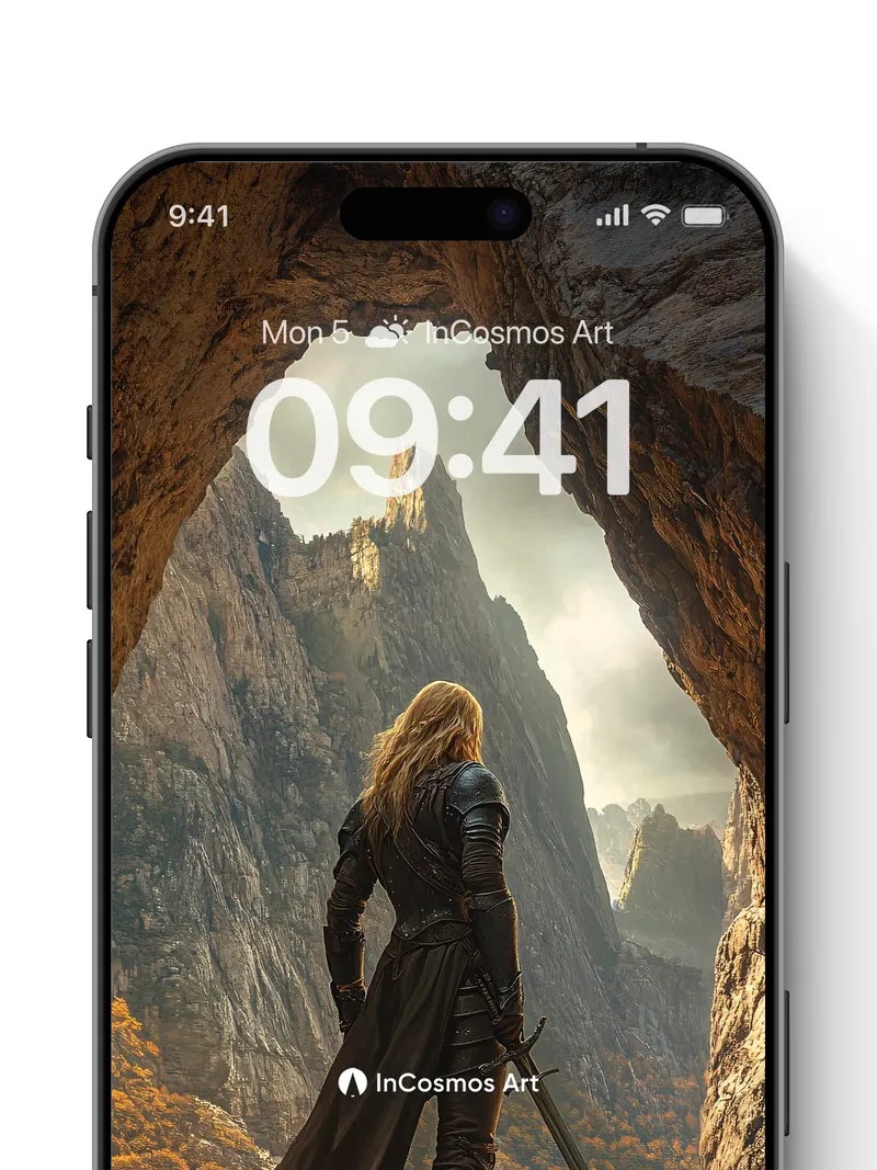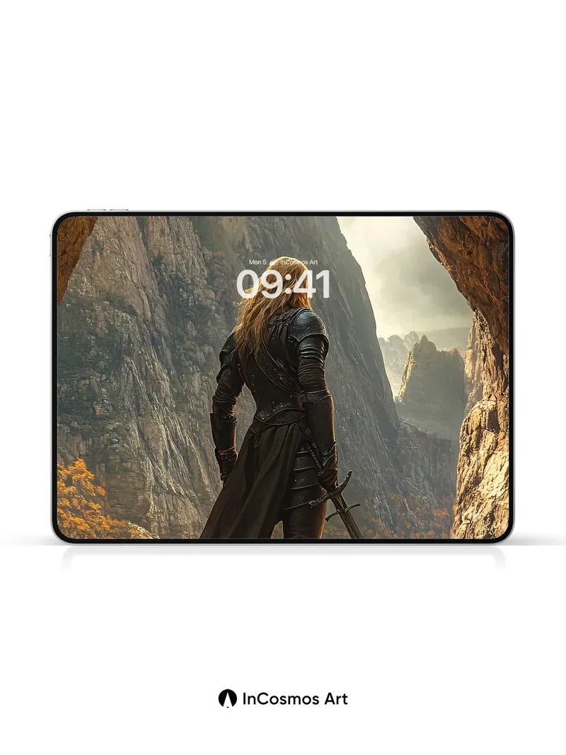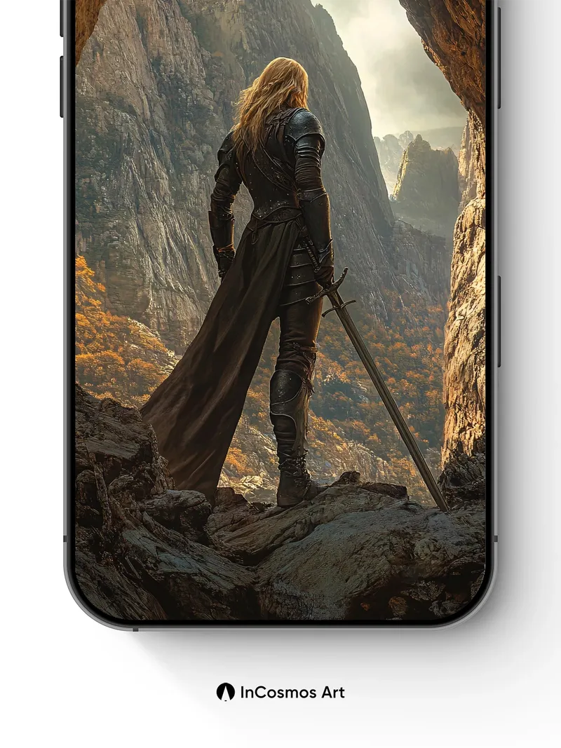 Debug product.metafields.custom.desc: Did you know that ancient warriors once believed cave entrances were portals to forgotten realms? Here, golden light crawls over jagged stone and steel, illuminating a lone figure poised between shadow and sky. The wind whispers through tattered cloth, carrying the scent of pine and distant fire, as if time itself pauses to watch her stand at the edge of legend.