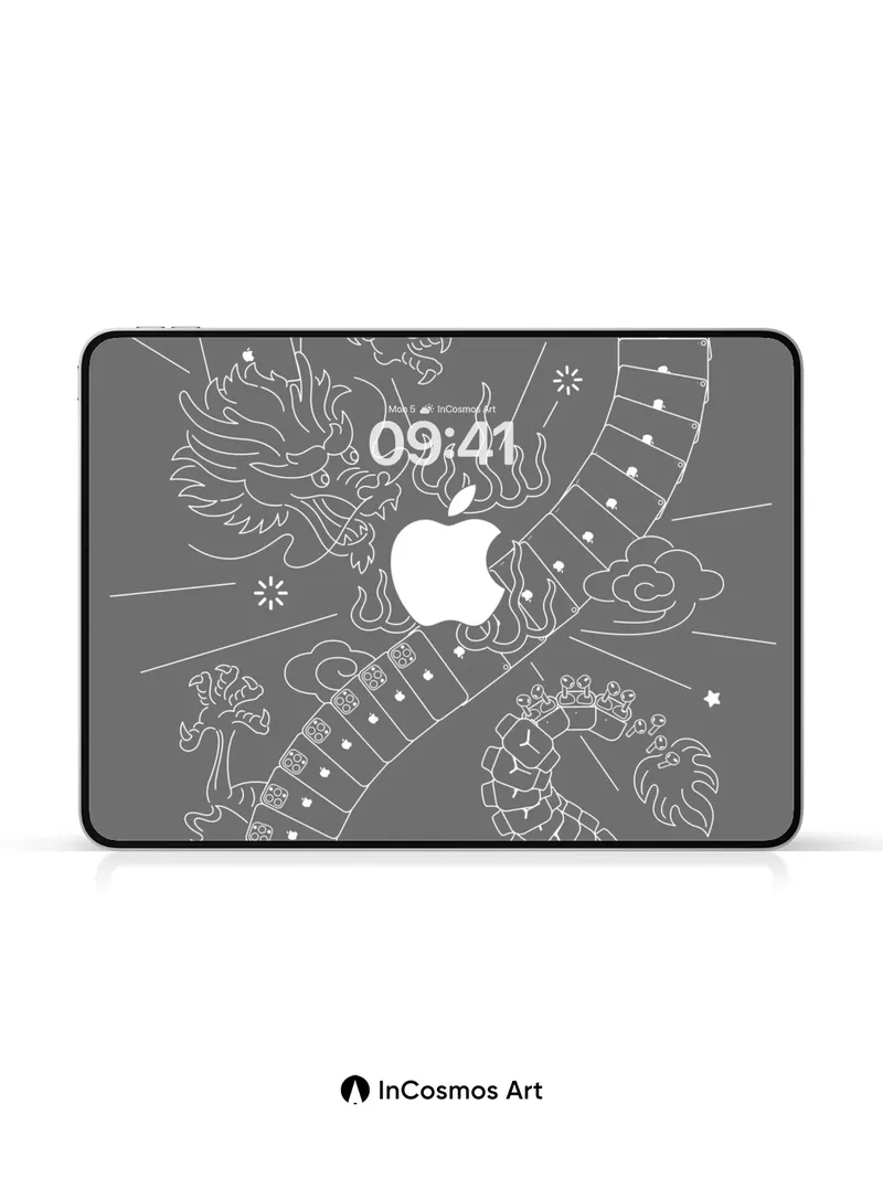 Debug page_description: Did you know ancient Chinese astronomers mapped the stars along the dragon’s spine? This monochrome myth spirals through clouds and constellations, its scales etched in digital precision, each segment a silent device glowing with inner fire. The Apple logo rests at the heart of the coil—cool, crisp, and unyielding—where technology meets legend in a breathless dance of circuitry and cloud. Share this with your best friend. Send this to your love and swap a matching set. What if every device you touched held a whisper of the sky?