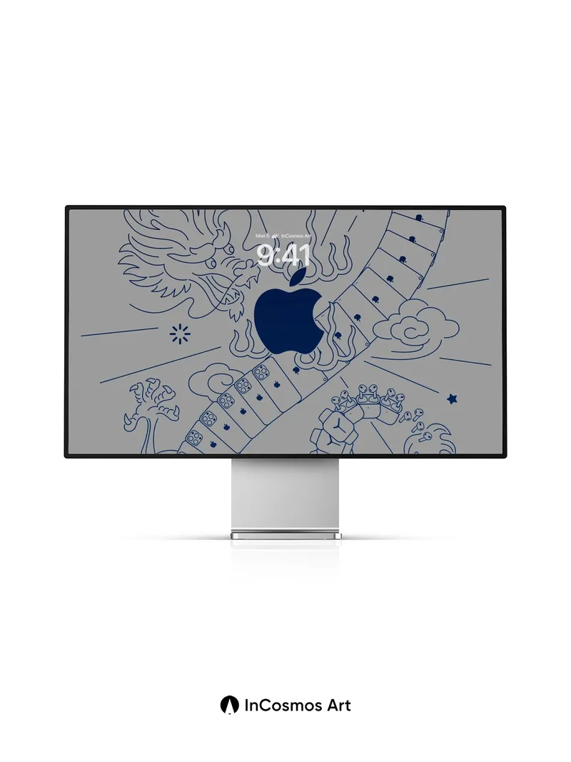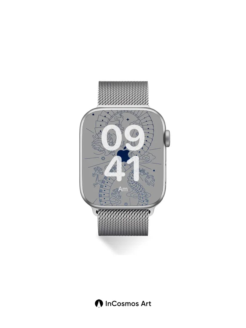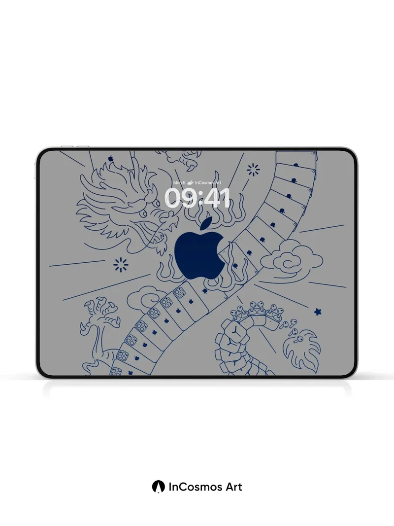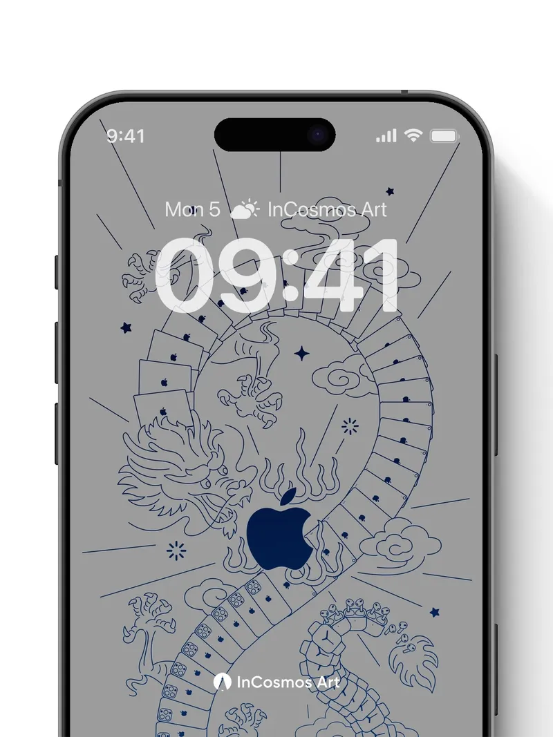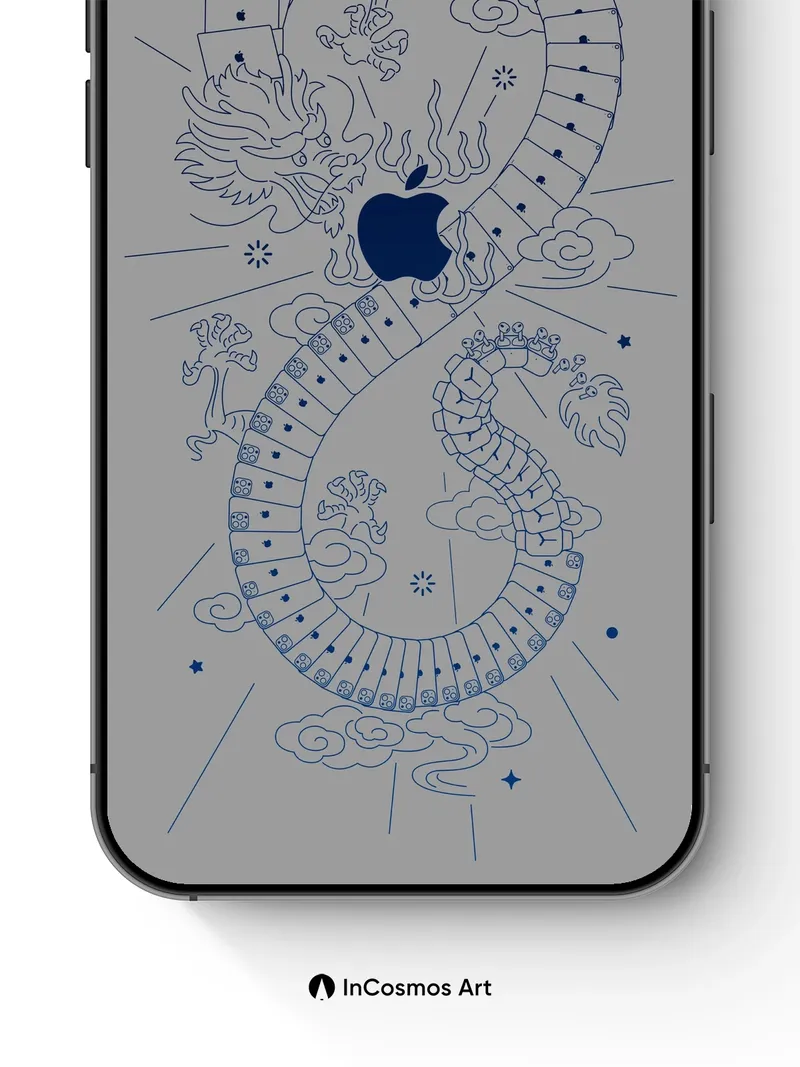 Debug product.metafields.custom.desc: Did you know ancient Chinese artisans carved dragons into jade to channel celestial energy? Here, a serpentine dragon coils through cloud-streaked skies, its body formed from cascading iPhone screens—each one glowing with a tiny Apple logo. The dark blue silhouette of the Apple logo rests at the heart of the dragon’s eye, where stars pulse like distant signals. Light crawls over the circuit-like scales, breathing life into myth and machine in equal measure.