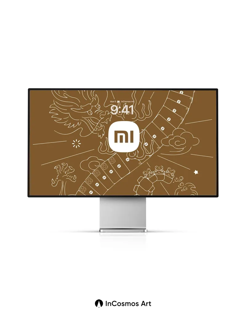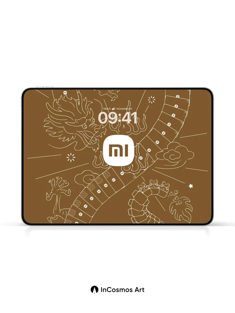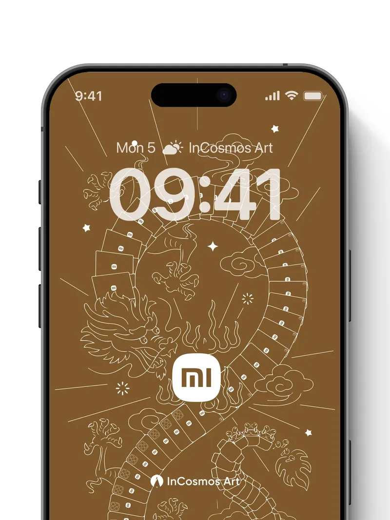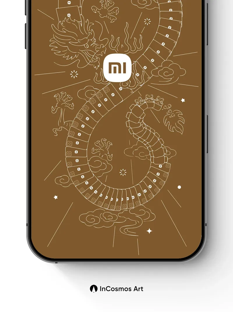 Did you know ancient Chinese believed dragons could control the weather, breathing fire and summoning clouds? Here, a mythic dragon coils in luminous white lines across a deep amber void, its scales forming a spiral of digital cards—each one glowing faintly like a memory. The Xiaomi logo rests at its heart, not as an intrusion but as a sacred seal, where technology and legend breathe together.