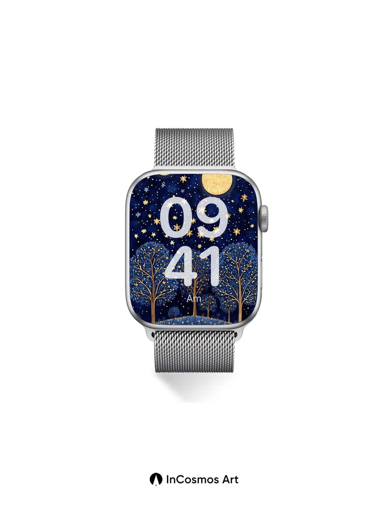 Debug product.metafields.custom.desc: Did you know ancient astronomers believed stars were tiny holes in a celestial dome? Here, golden constellations shimmer like powdered metal across a midnight sky, while twin moons swirl with hypnotic patterns. The trees stand as silent sentinels, their branches etched in bronze and crowned with starlight, rooted in a field where flowers bloom in quiet defiance of night.