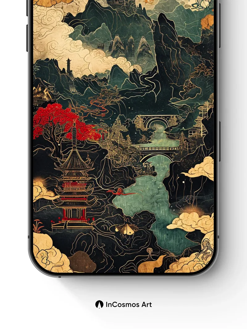 Celestial Ink Wallpaper with Floating Pagodas
