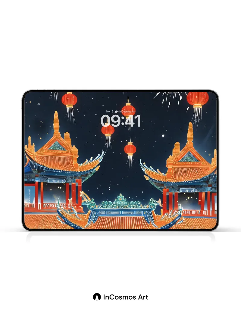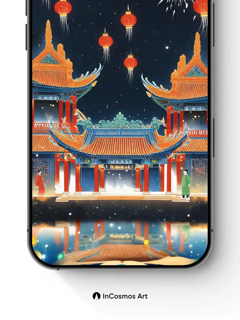 Debug product.metafields.custom.desc: Did you know ancient Chinese believed lanterns carried wishes to the heavens? Now, crimson paper lanterns drift like breath in a starlit sky, their glow mirrored in still water below. Beneath them, a temple’s curved eaves shimmer with jade and gold, while fireworks burst in silent arcs—each spark a fleeting prayer. You stand at the edge of myth, where architecture meets dream.