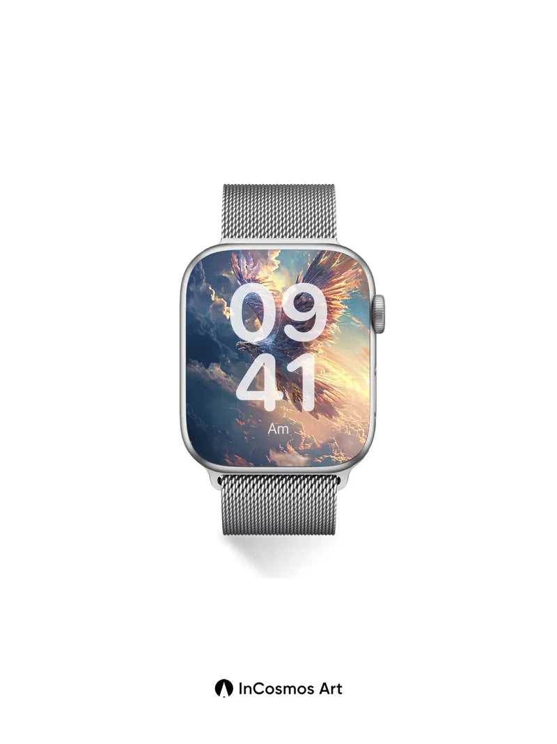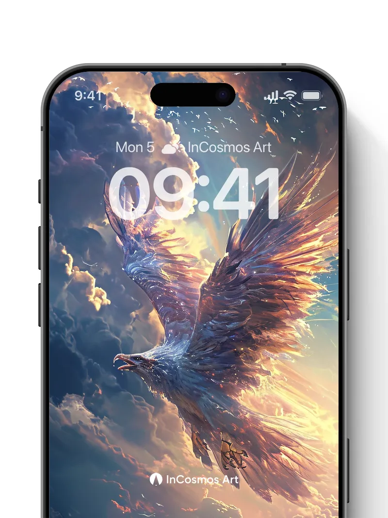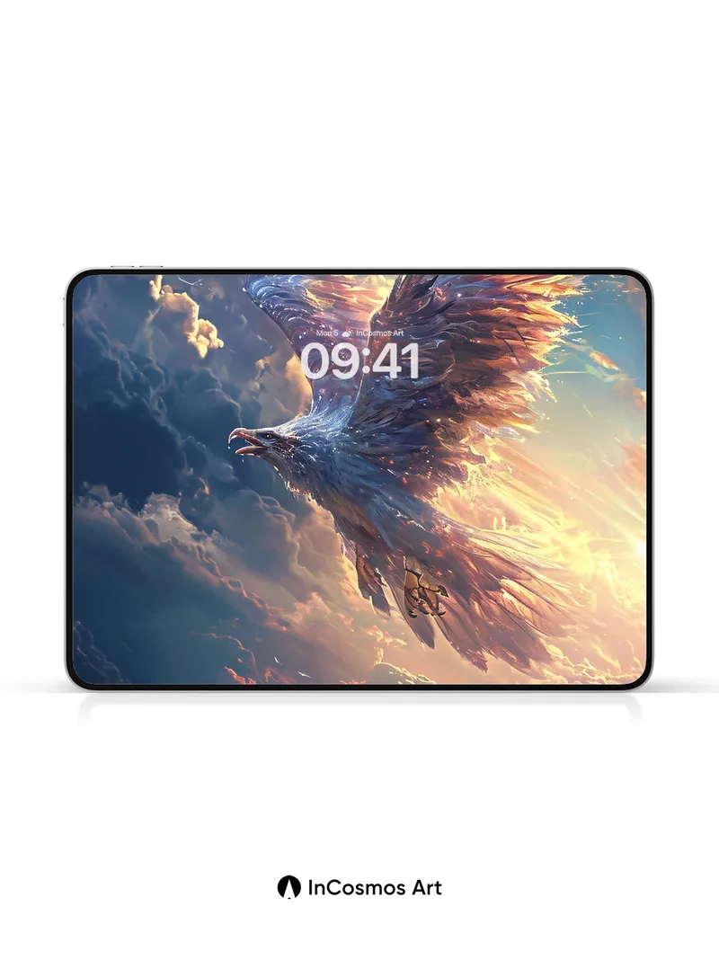 Debug product.metafields.custom.desc: Did you know that eagles can see four times farther than humans, spotting prey from over two miles away? Here, a mythic bird of prey cuts through the heavens, its feathers glowing like molten amber and silver under a sky alive with storm and sunrise. Light crawls across each feather, breathing warmth into the chaos of clouds below, where shadows curl like sleeping dragons.