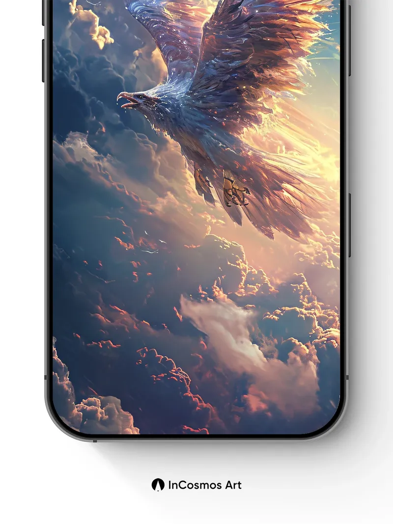 Debug og_description: Did you know that eagles can see four times farther than humans, spotting prey from over two miles away? Here, a mythic bird of prey cuts through the heavens, its feathers glowing like molten amber and silver under a sky alive with storm and sunrise. Light crawls across each feather, breathing warmth into the chaos of clouds below, where shadows curl like sleeping dragons.