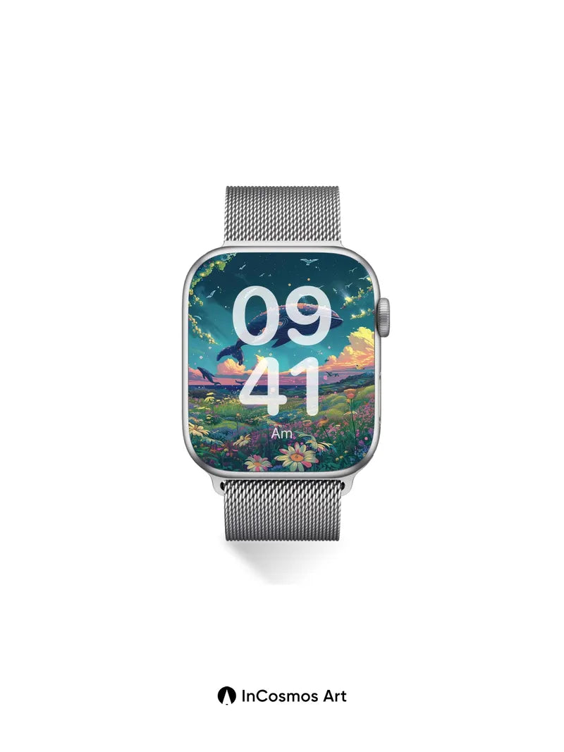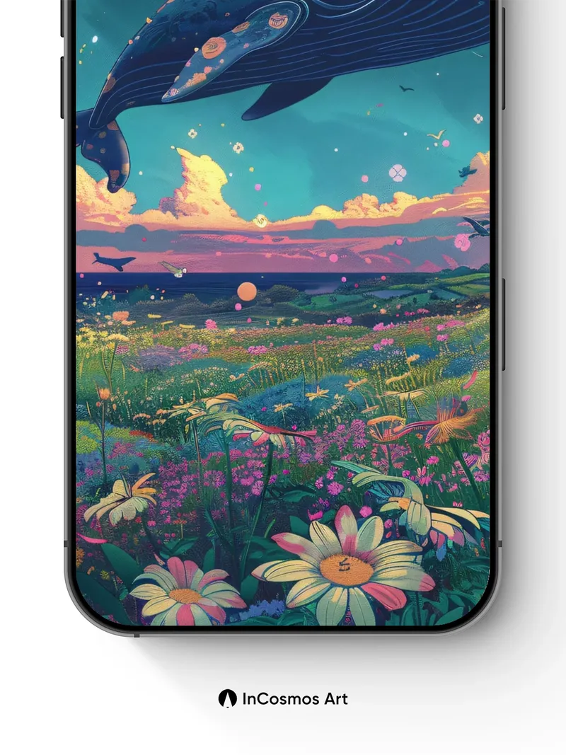 Did you know that whales communicate across oceans using frequencies too low for human ears to detect? Here, a colossal whale glides through a sky painted in twilight hues, its skin shimmering like obsidian studded with constellations, while vines of luminous blossoms arc overhead like celestial garlands. Below, a meadow breathes in color—petals unfurling in slow motion under a gradient sky where birds and fish swim through the same air, blurring the line between sea and sky.