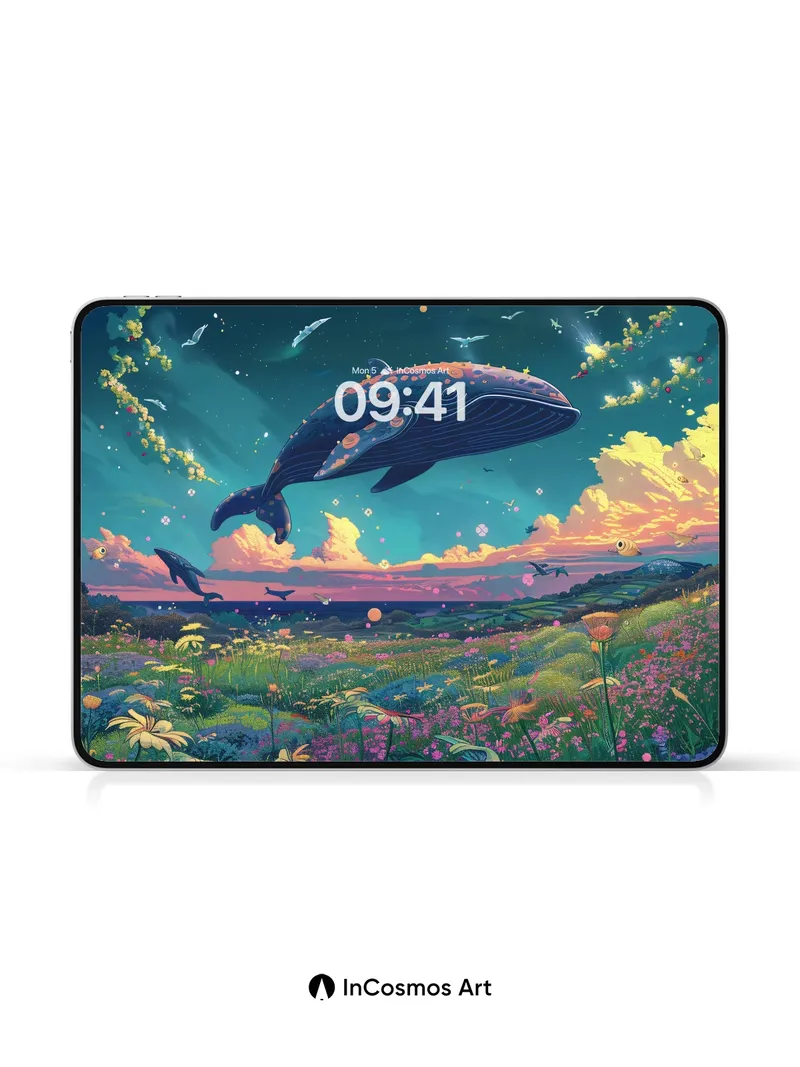Debug page_description: Did you know that whales communicate across oceans using frequencies too low for human ears to detect? Here, a colossal whale glides through a sky painted in twilight hues, its skin shimmering like obsidian studded with constellations, while vines of luminous blossoms arc overhead like celestial garlands. Below, a meadow breathes in color—petals unfurling in slow motion under a gradient sky where birds and fish swim through the same air, blurring the line between sea and sky. Share this with your best friend. Send this to your love and swap a matching set. What if dreams had their own gravity?