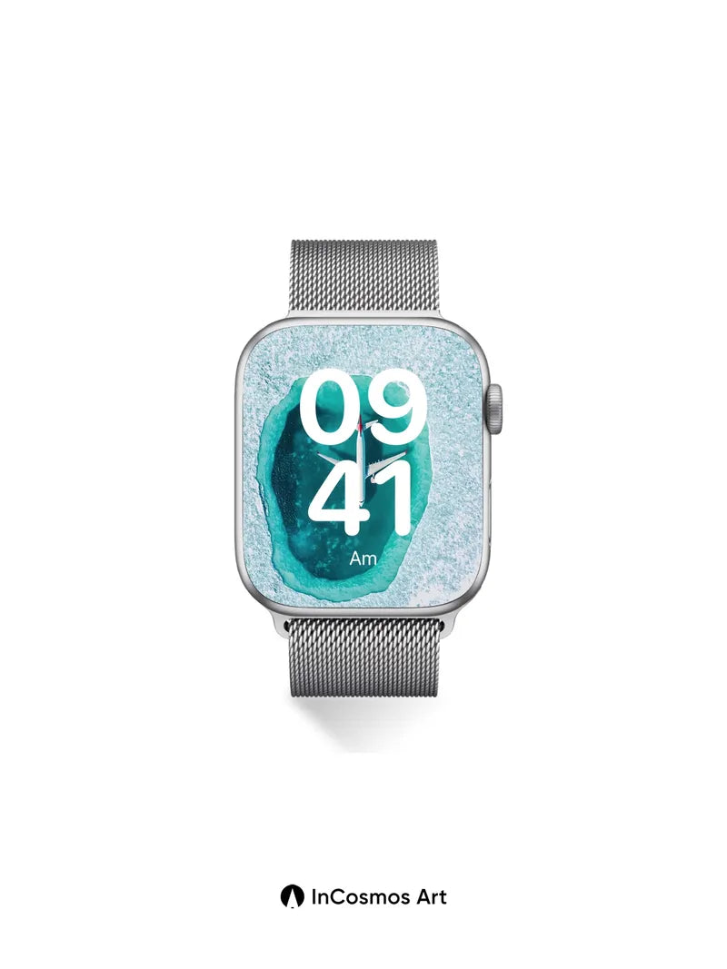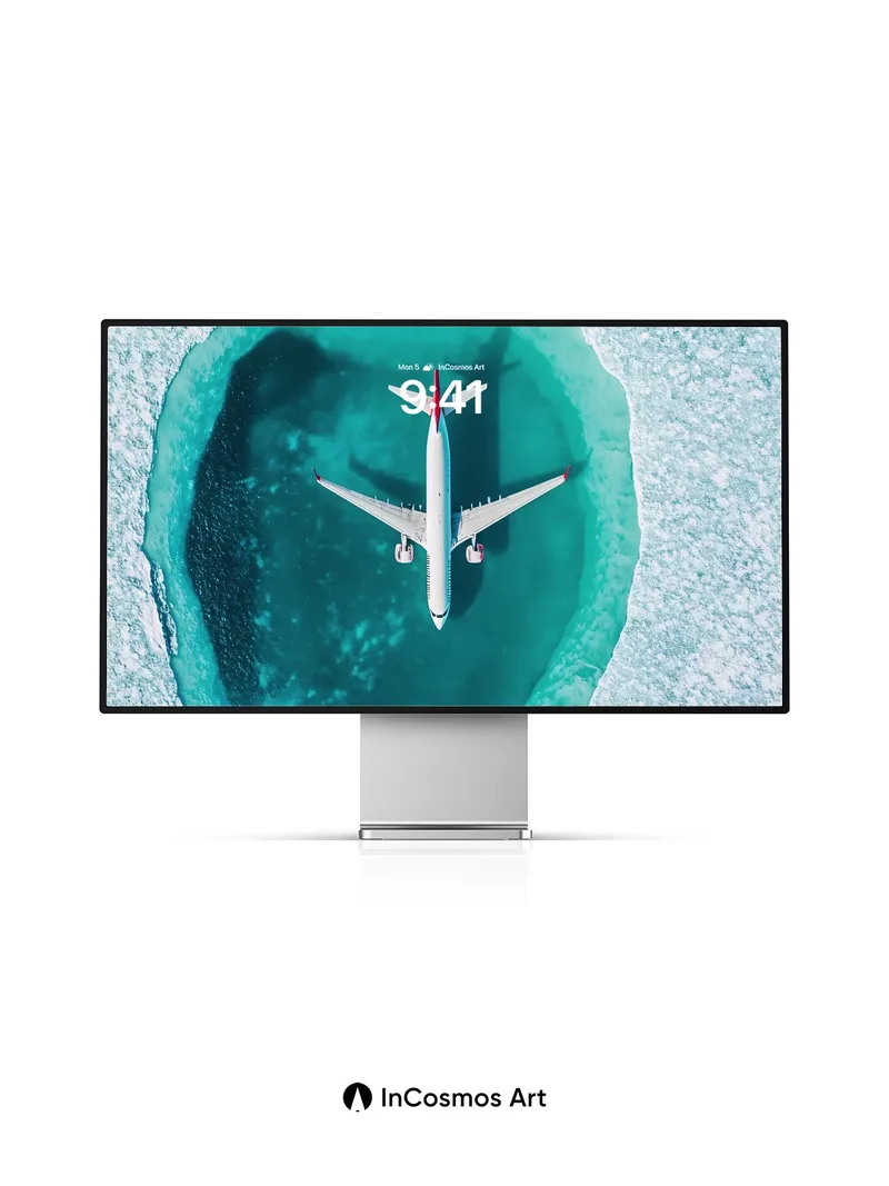 Debug product.metafields.custom.desc: Did you know the ocean's surface can refract light like a prism, turning turquoise into liquid sapphire? Here, an airplane hovers over a perfect circular lagoon, its shadow stretching like a silent echo beneath translucent waves. The water breathes in layers—crystal rim to deep indigo core—while the aircraft glides as if suspended between sky and sea, a moment of stillness in motion.
