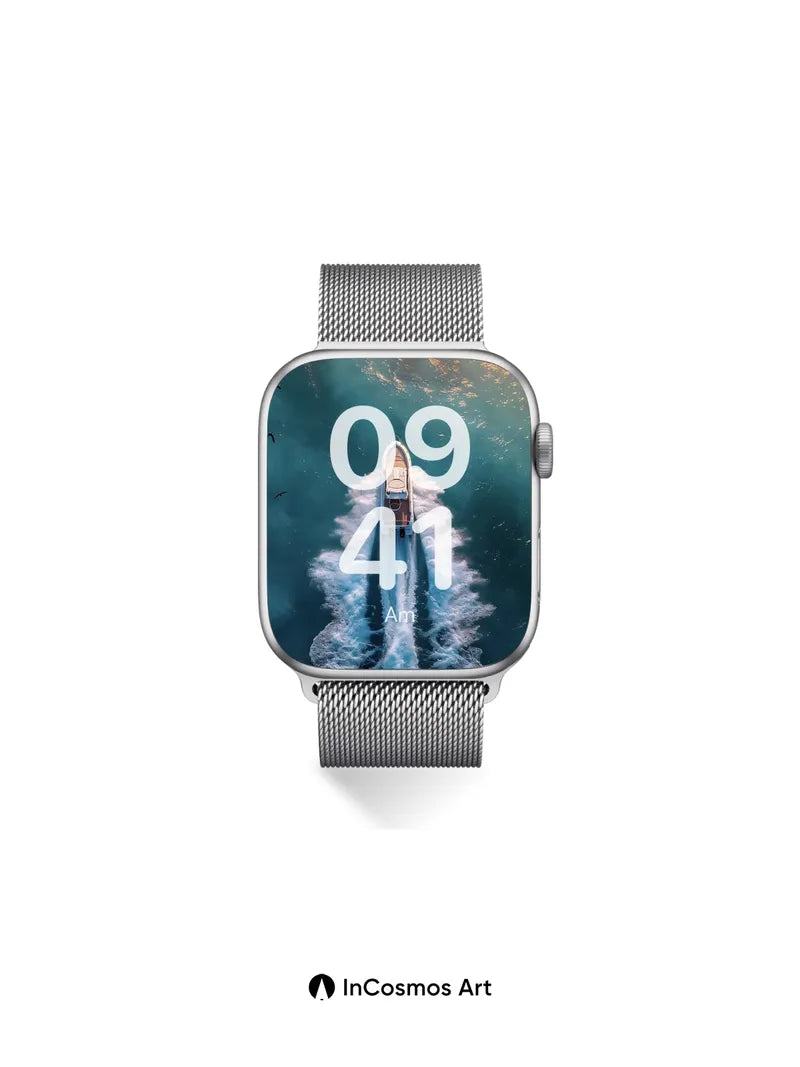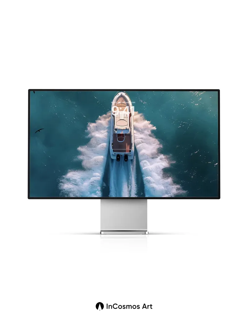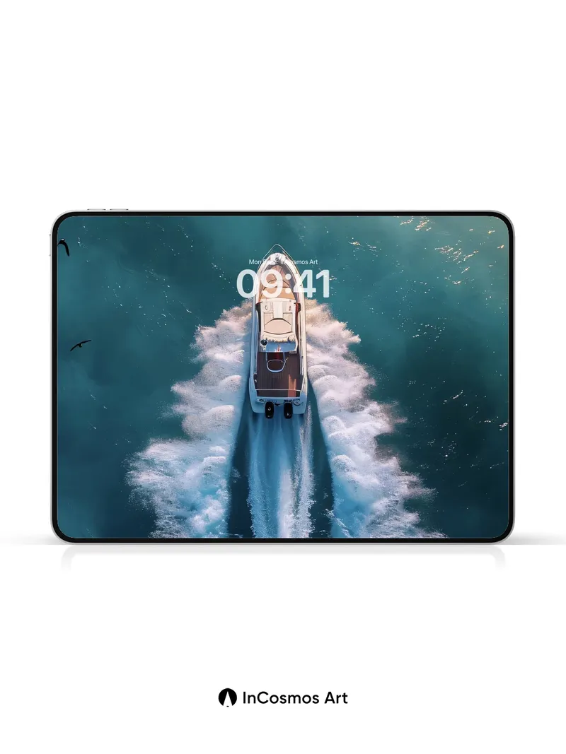 Debug product.metafields.custom.desc: Did you know the ocean's surface can reflect sunlight like liquid gold, especially at dawn? This image captures a sleek yacht slicing through deep teal waters, leaving a frothy wake that glimmers like crushed diamonds under a golden sky. Seagulls glide above, their silhouettes fleeting against the vastness. The water breathes with motion—each wave a whisper of escape, each ripple a story untold.