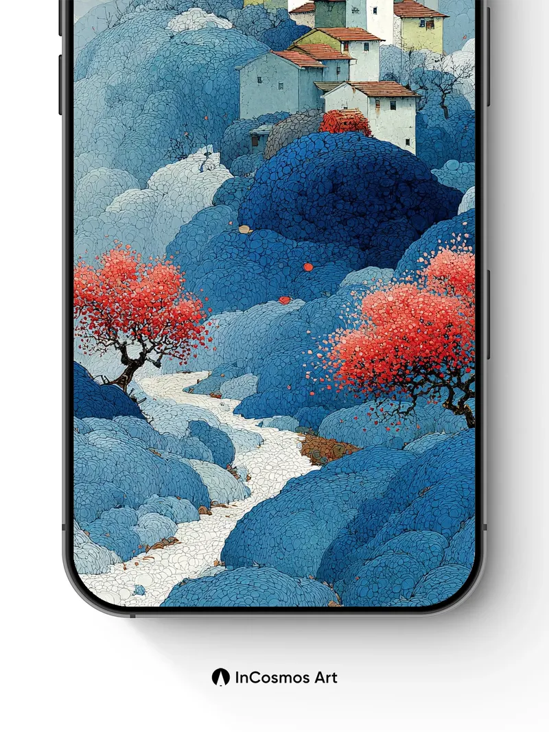 Did you know that ancient Chinese painters used mineral pigments to create depth in mountain scenes? Here, cobalt-blue hills breathe like living waves, each ridge textured with fine brushstrokes that catch the light like frost on silk. Crimson trees pulse at the valley’s edge, their petals drifting over a path of white stone as if time itself has paused to watch the quiet rise of a village nestled in the sky.