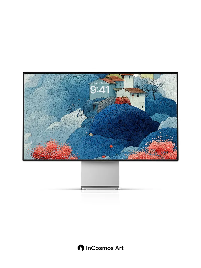 Debug product.metafields.custom.desc: Did you know that ancient Chinese painters used mineral pigments to create depth in mountain scenes? Here, cobalt-blue hills breathe like living waves, each ridge textured with fine brushstrokes that catch the light like frost on silk. Crimson trees pulse at the valley’s edge, their petals drifting over a path of white stone as if time itself has paused to watch the quiet rise of a village nestled in the sky.
