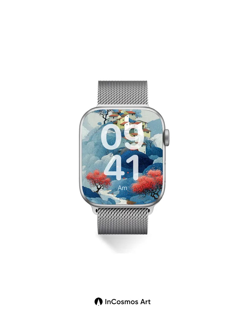 Debug page_description: Did you know that ancient Chinese painters used mineral pigments to create depth in mountain scenes? Here, cobalt-blue hills breathe like living waves, each ridge textured with fine brushstrokes that catch the light like frost on silk. Crimson trees pulse at the valley’s edge, their petals drifting over a path of white stone as if time itself has paused to watch the quiet rise of a village nestled in the sky. Share this with your best friend. Send this to your love and swap a matching set. What would it feel like to walk through a world where mountains are painted with dreams?
