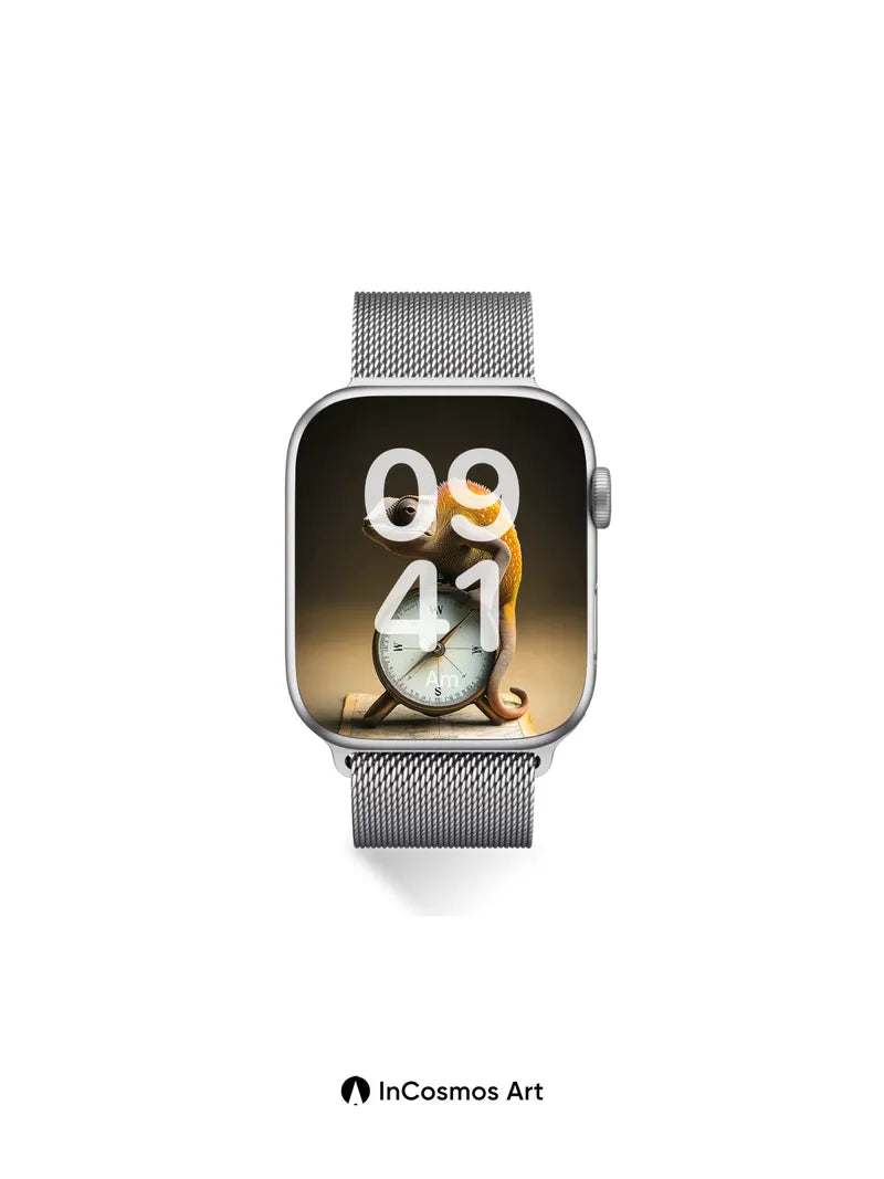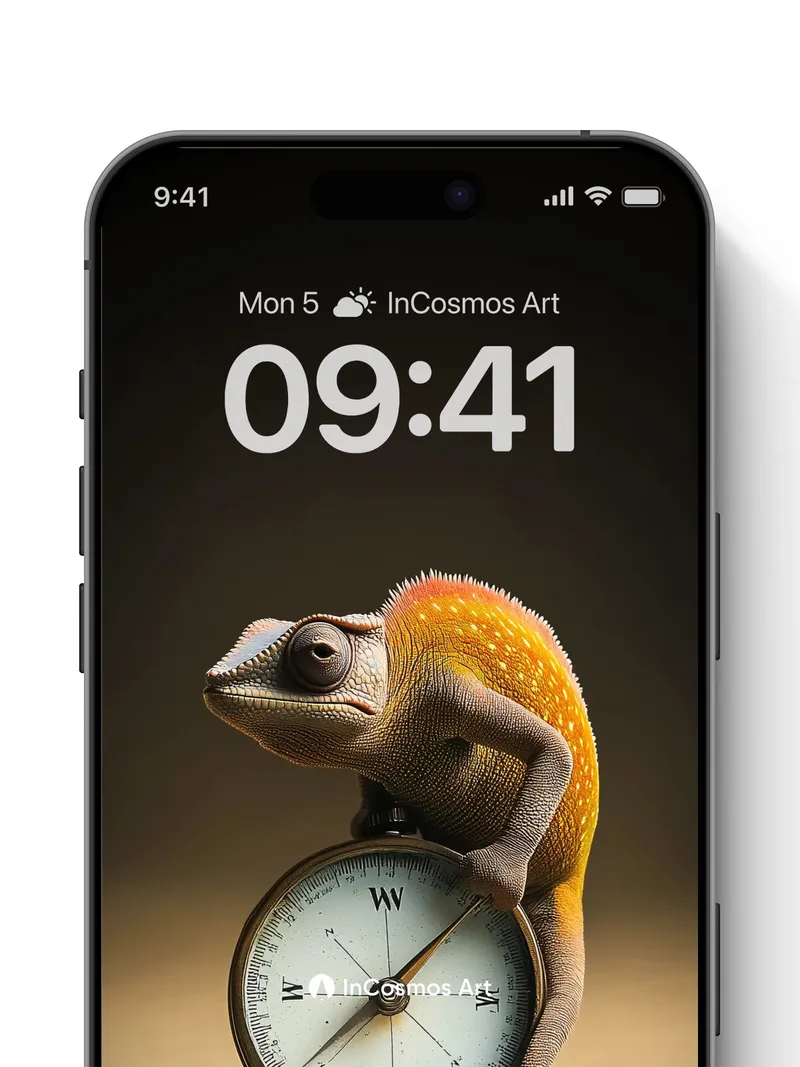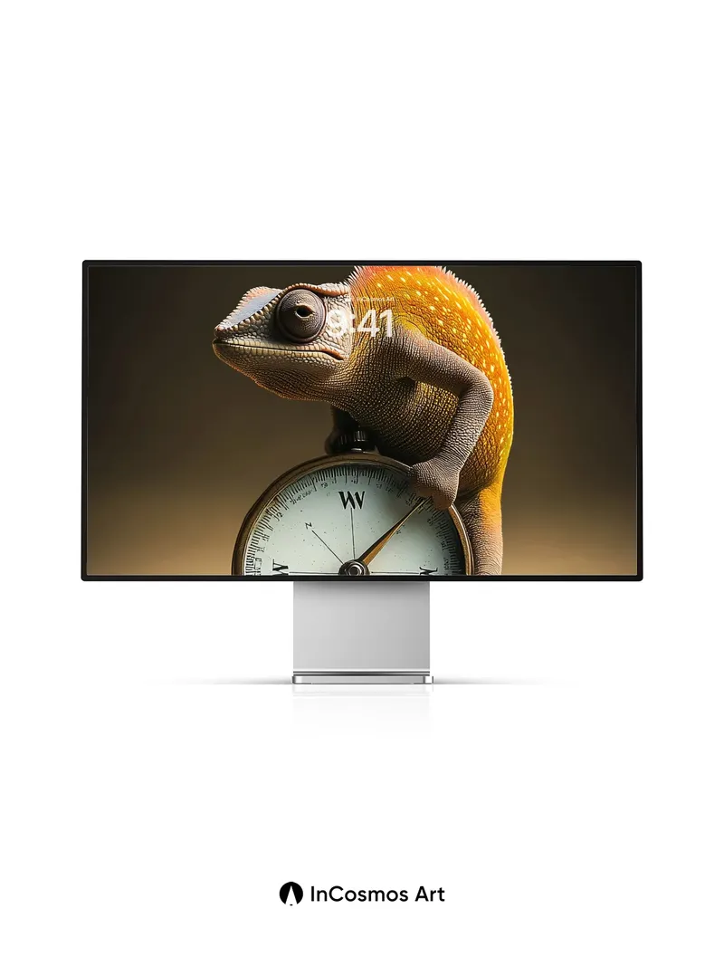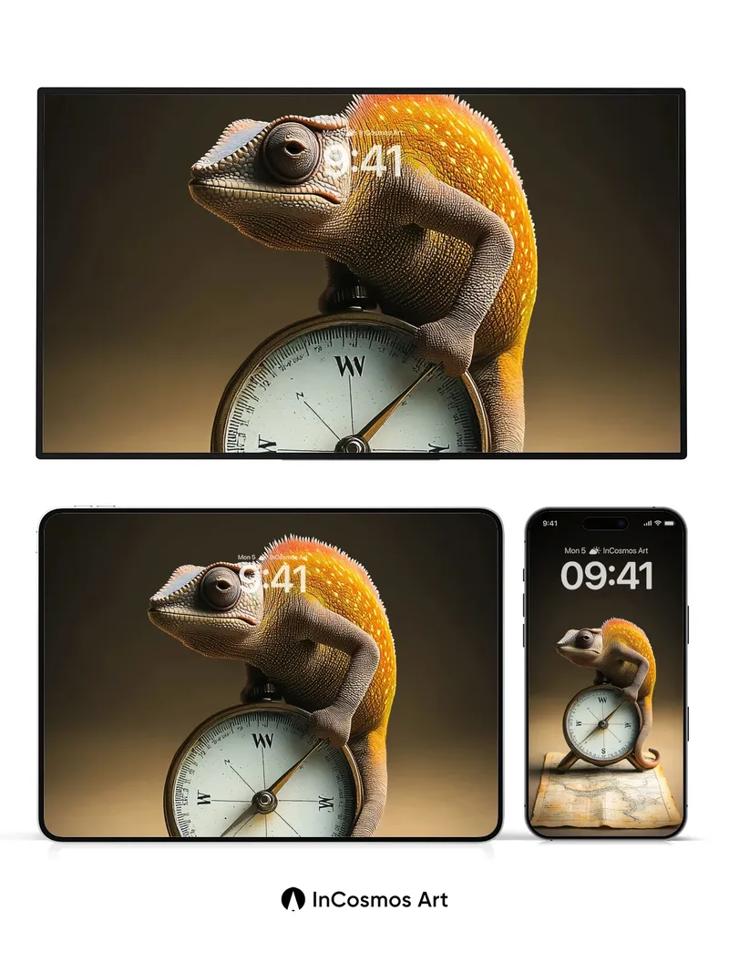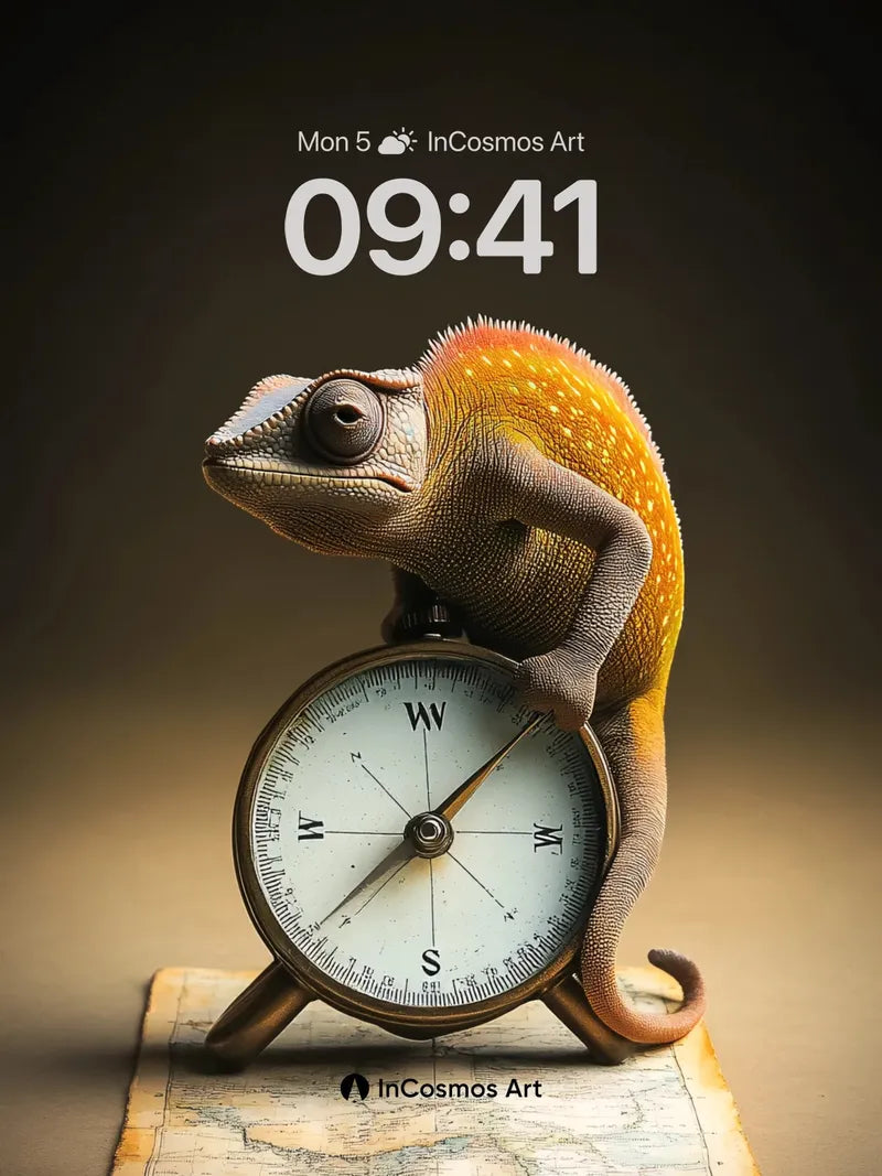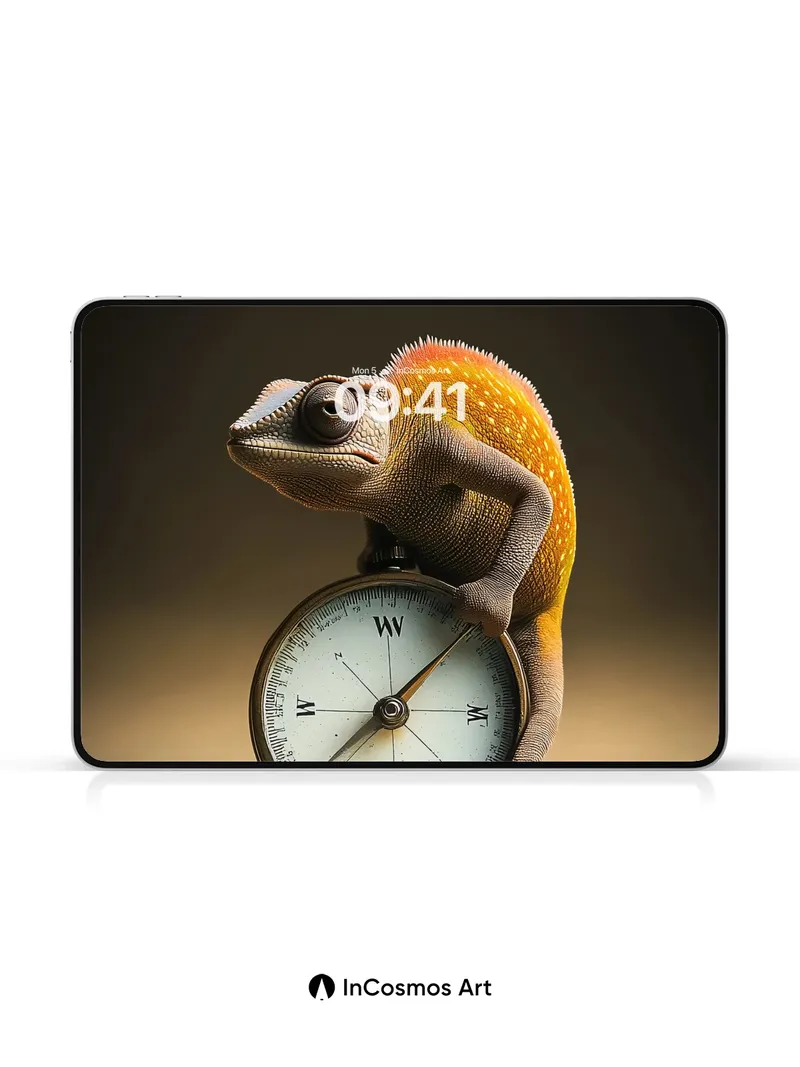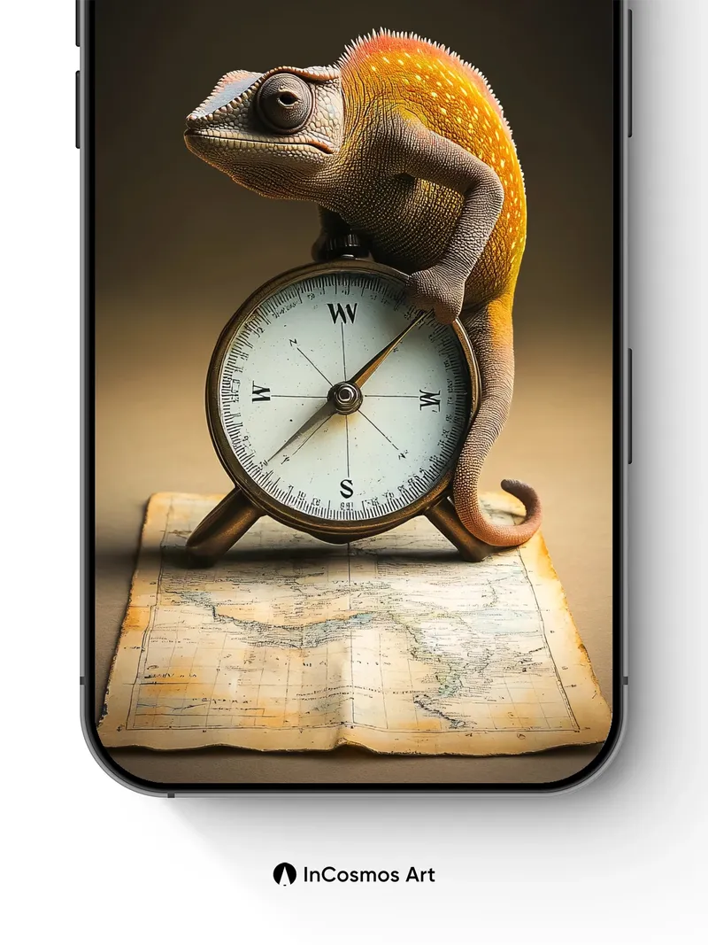 Debug product.metafields.custom.desc: Did you know chameleons can rotate their eyes independently to scan landscapes? Here, one perches atop a brass compass, its skin shimmering in warm amber and rust hues as light crawls over textured scales and aged metal. The creature’s tail curls like a question mark over an old parchment map, where faded ink traces forgotten routes beneath a soft spotlight that breathes life into every crease and grain.