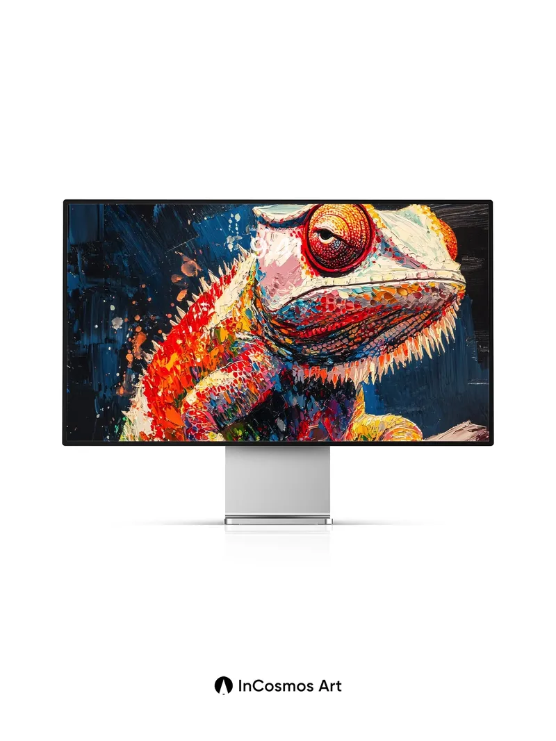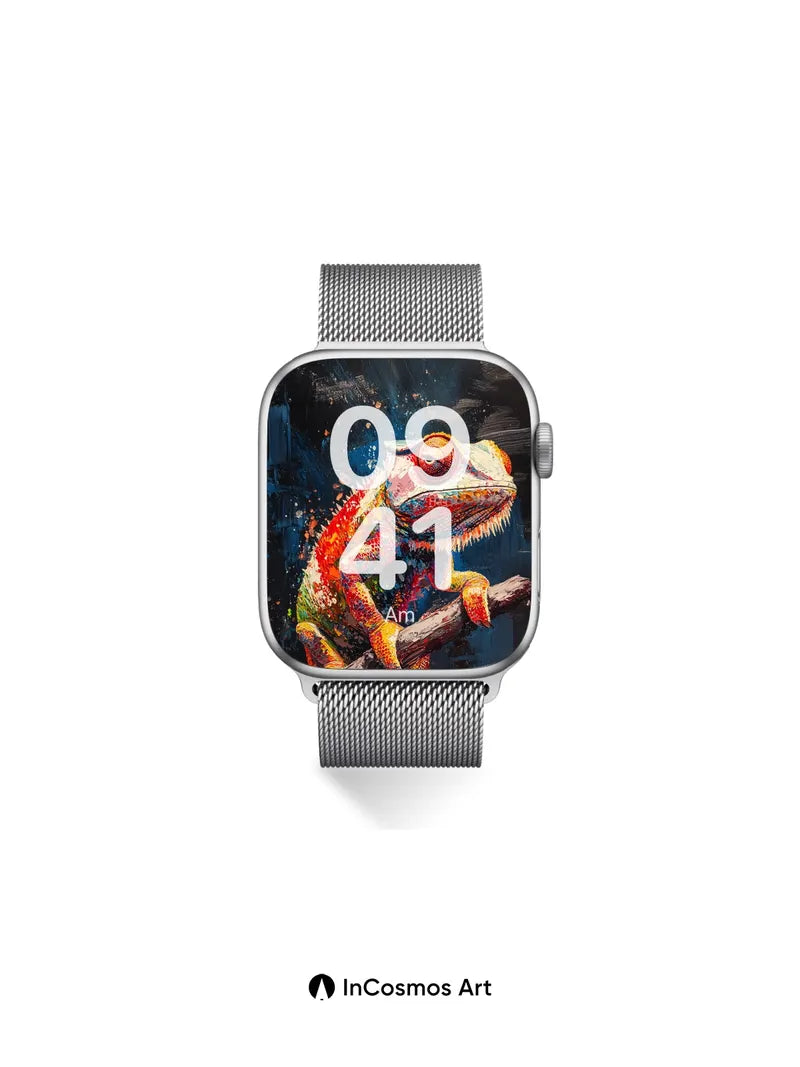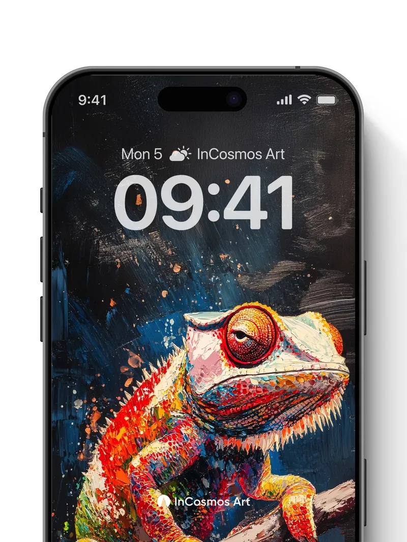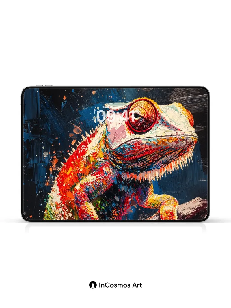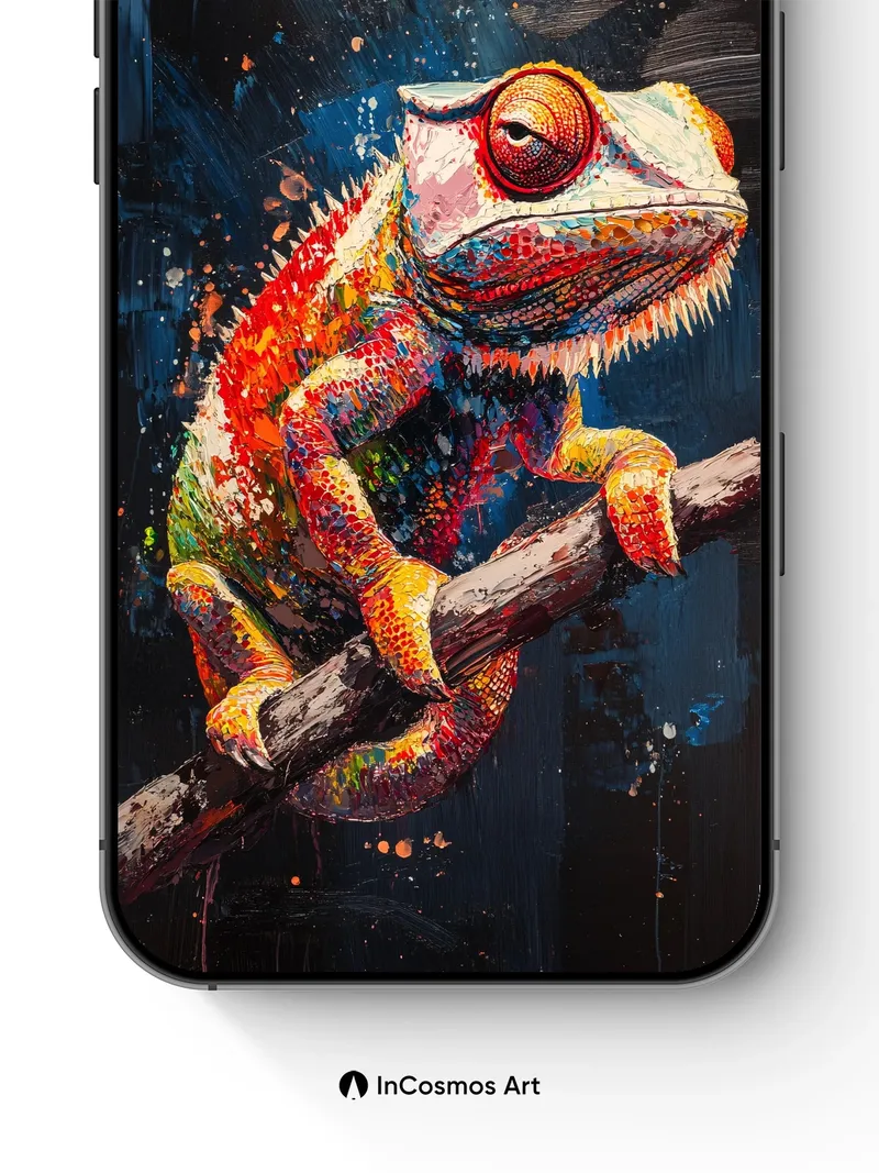 Debug product.metafields.custom.desc: Did you know chameleons can change color not just for camouflage, but to express emotion—each scale a living canvas of mood? This vibrant creature clings to a branch like a burst of painted light, its skin shimmering with iridescent hues that seem to breathe against the deep, star-streaked night. The background pulses with abstract energy, as if the universe itself is painting through the reptile’s gaze.