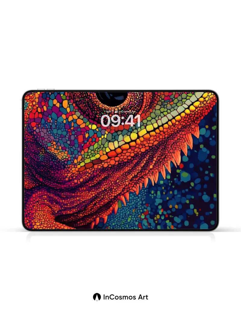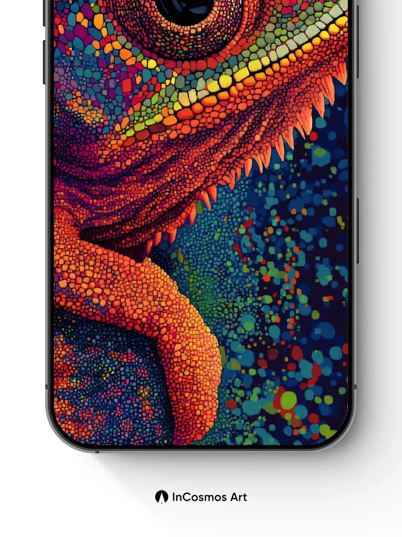 Debug page_description: Did you know chameleons change color not just for camouflage, but to communicate mood and temperature? Here, each scale pulses like a living mosaic, breathing rainbow light through a digital skin of tiny dots. The eye holds a universe—deep black at its core, swirling with chromatic fire—while the background dissolves into a nebula of scattered pixels, as if the creature is emerging from a dream machine. Share this with your best friend. Send this to your love and swap a matching set. What if your phone could feel the warmth of a chameleon’s gaze?