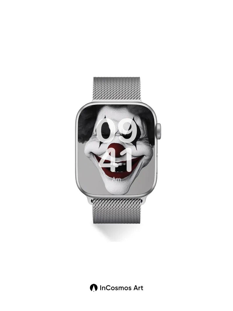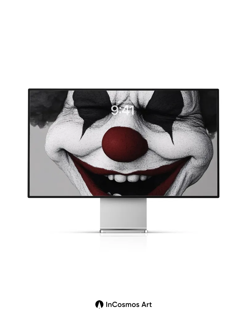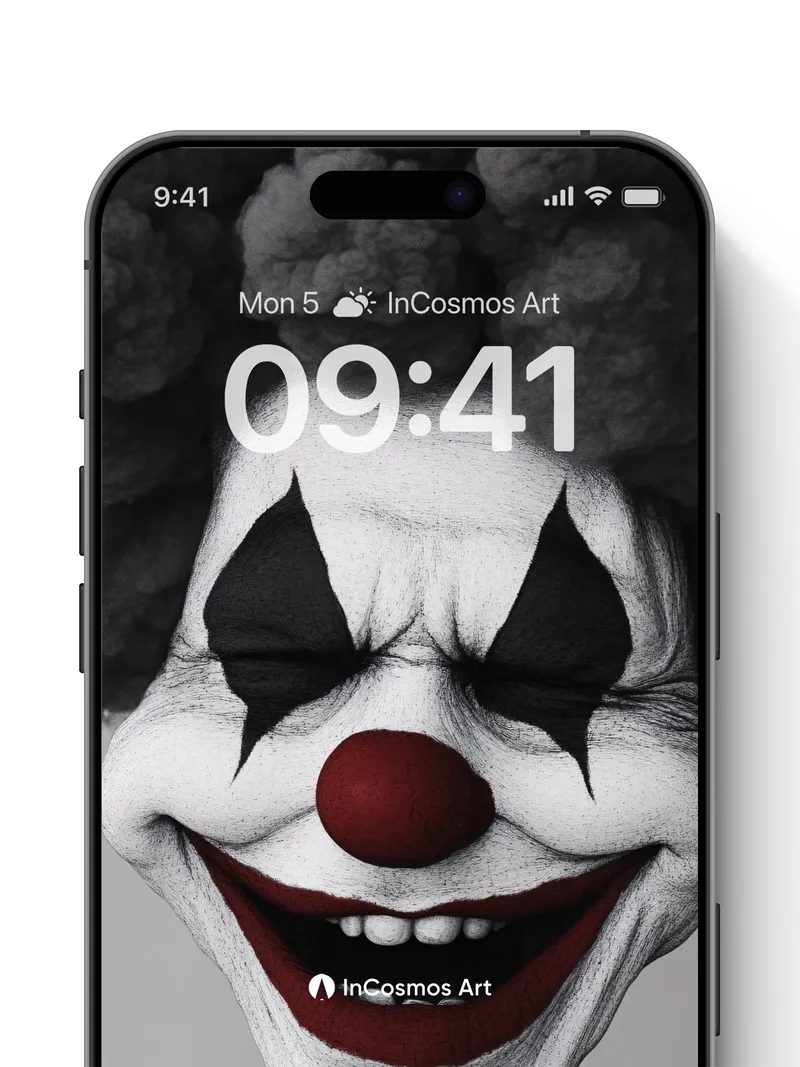Debug product.metafields.custom.desc: Did you know clowns were once sacred figures in ancient Roman theater, believed to ward off evil spirits? This face, painted in stark white and shadowed by jagged black triangles, breathes with a quiet menace—its red lips stretched too wide, teeth gleaming like broken glass under cold light. The curls above resemble storm clouds, swirling just beyond the edge of vision, as if the sky itself is laughing at your fear.