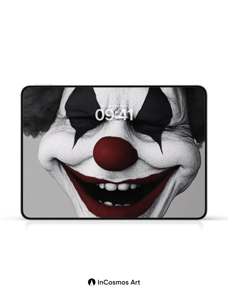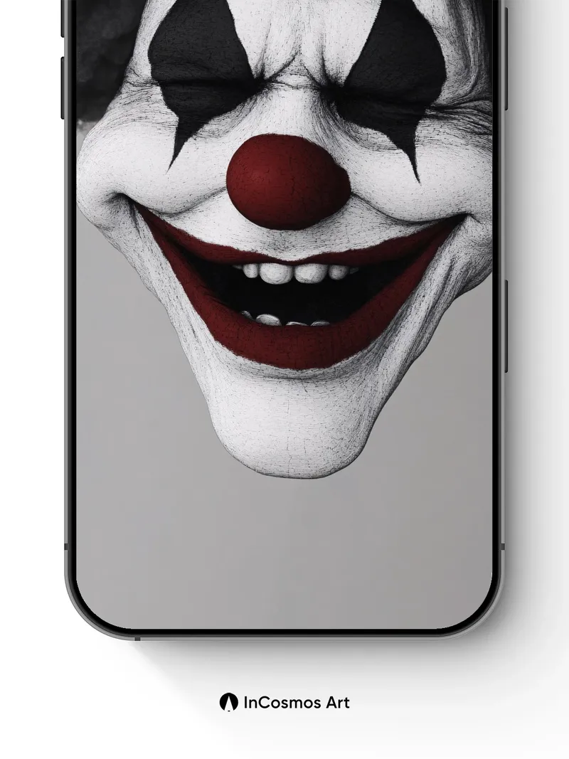 Debug og_description: Did you know clowns were once sacred figures in ancient Roman theater, believed to ward off evil spirits? This face, painted in stark white and shadowed by jagged black triangles, breathes with a quiet menace—its red lips stretched too wide, teeth gleaming like broken glass under cold light. The curls above resemble storm clouds, swirling just beyond the edge of vision, as if the sky itself is laughing at your fear.