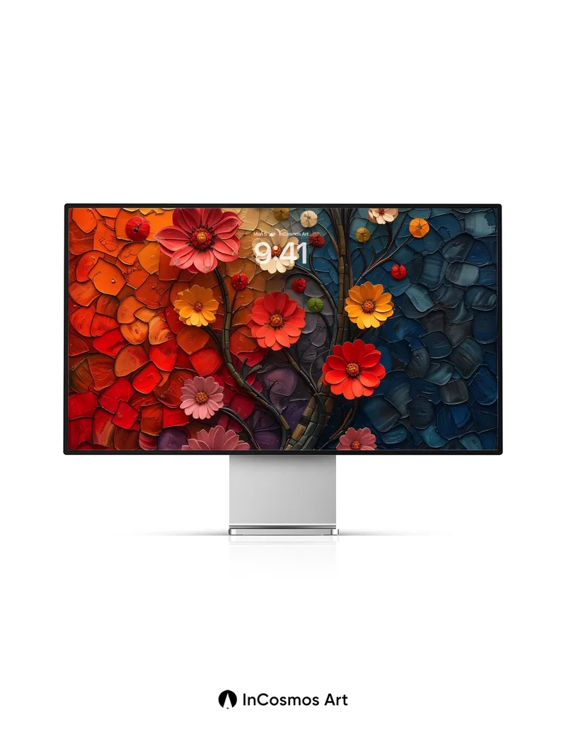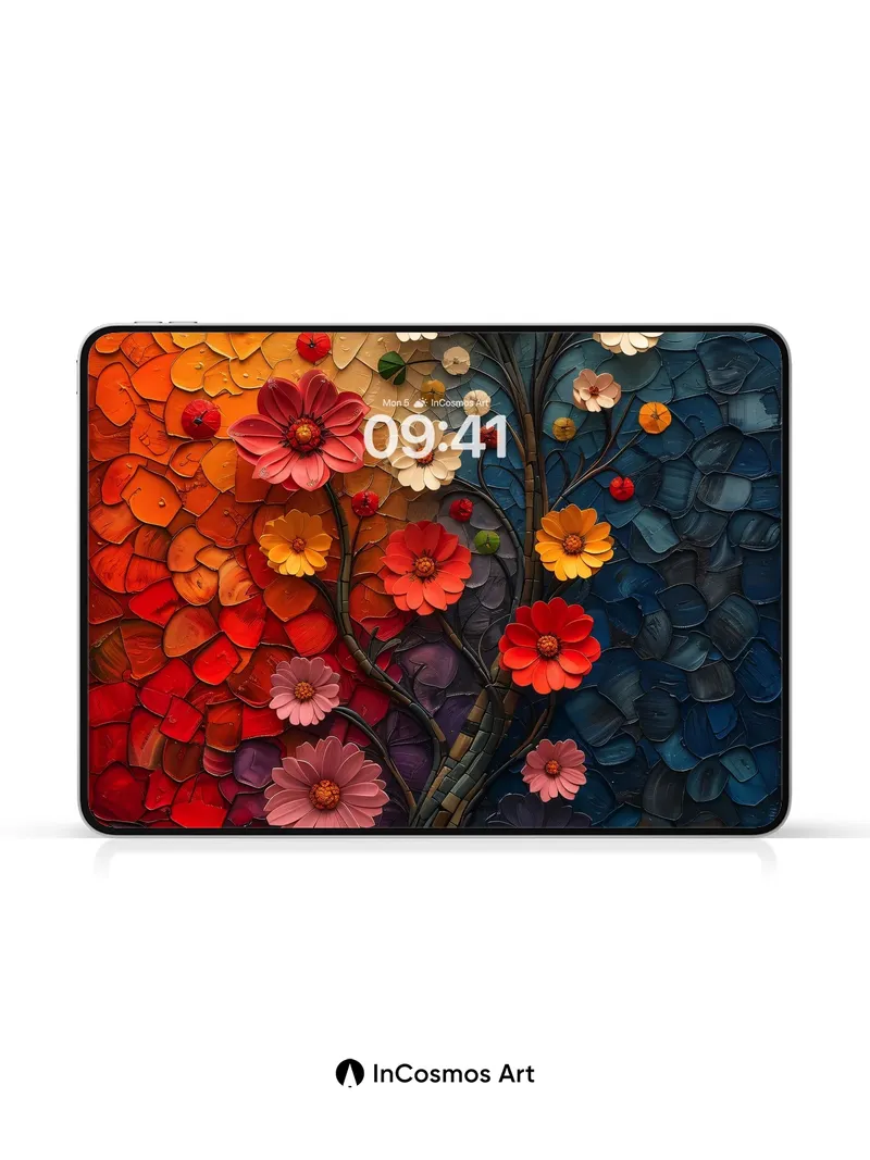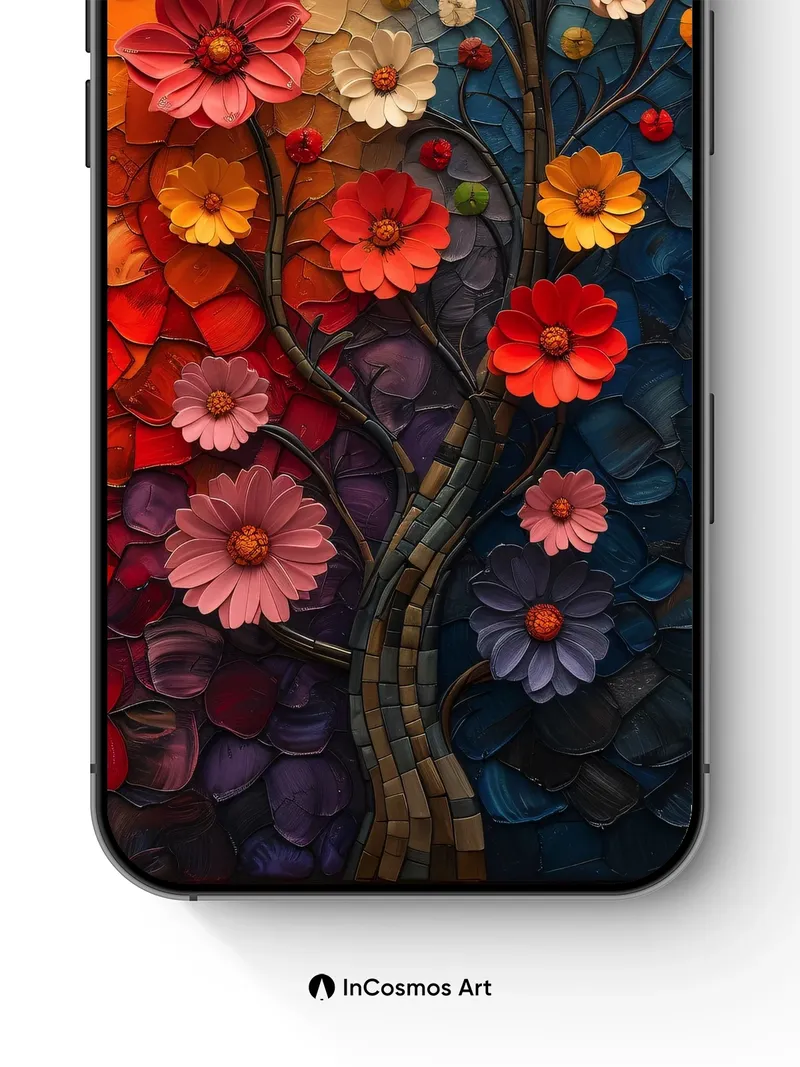 Debug page_description: Did you know that mosaic art dates back to the 13th century BC, where ancient artisans used tiny stones to tell stories? Here, color breathes through tessellated petals and bark-like textures, each fragment glowing like a captured sunset. The tree’s veins pulse with warmth, splitting into fiery oranges and deep indigo, as if nature itself is painted in stained glass. Share this with your best friend. Send this to your love and swap a matching set. What if every wall could remember the season it was born in?