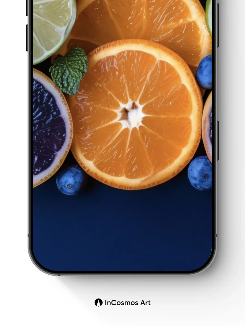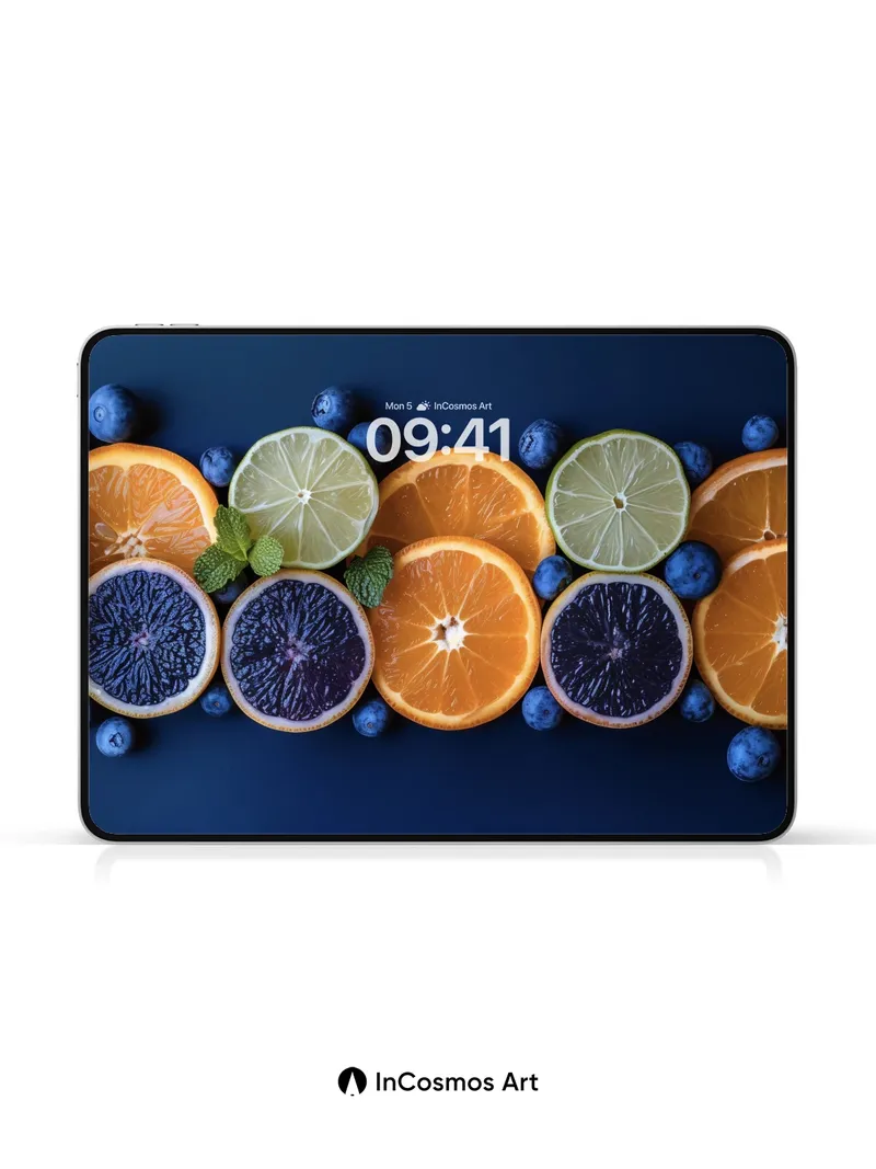 Debug product.metafields.custom.desc: Did you know citrus peels contain essential oils that release a fragrance when cold-pressed? Here, sliced oranges, limes, and grapefruits rest like stained glass under a velvet indigo sky, their pulpy interiors glowing with translucent honey-light. Blueberries scatter like tiny constellations, each one a polished gem reflecting the cool breath of night. The lime’s green is sharp as a blade, while the orange’s rind holds secrets in its textured pores—nature’s own mosaic.