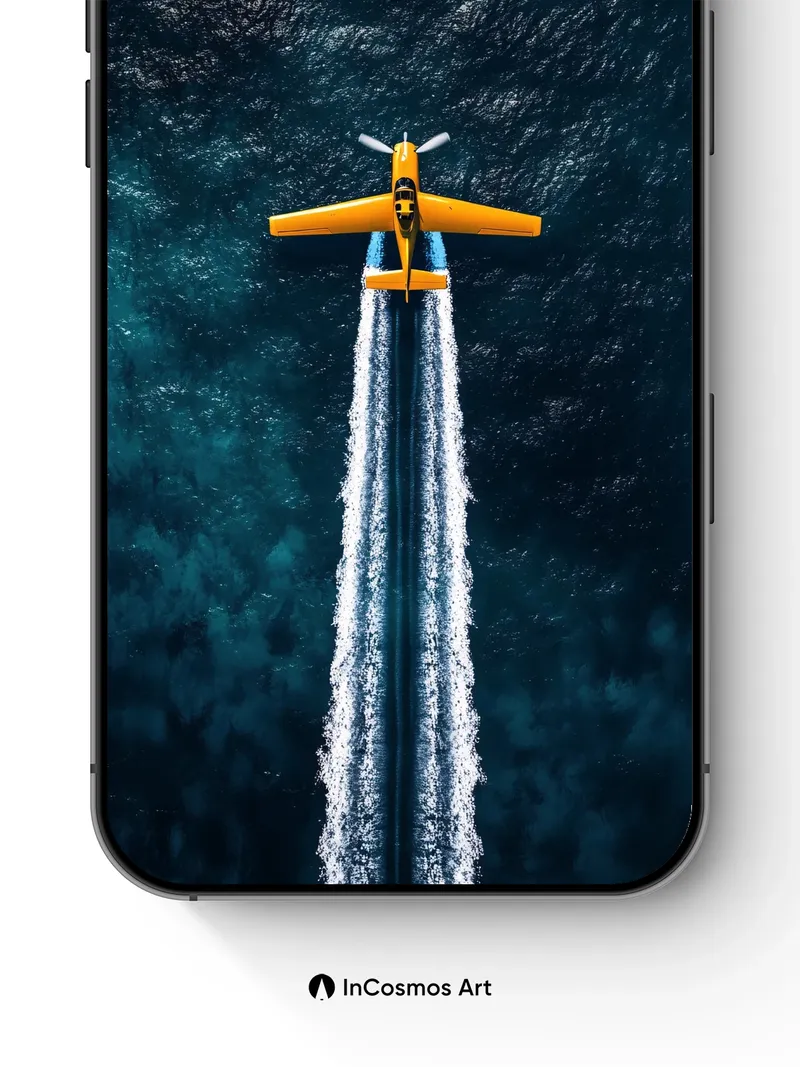 Did you know seaplanes leave trails that shimmer like liquid silver when viewed from above? This image captures a vibrant yellow aircraft slicing through deep oceanic blues, its wake fracturing the water into cascading ribbons of foam and light. The contrast between the mechanical precision of the plane and the wild texture of the sea evokes a sense of freedom suspended between sky and depth.