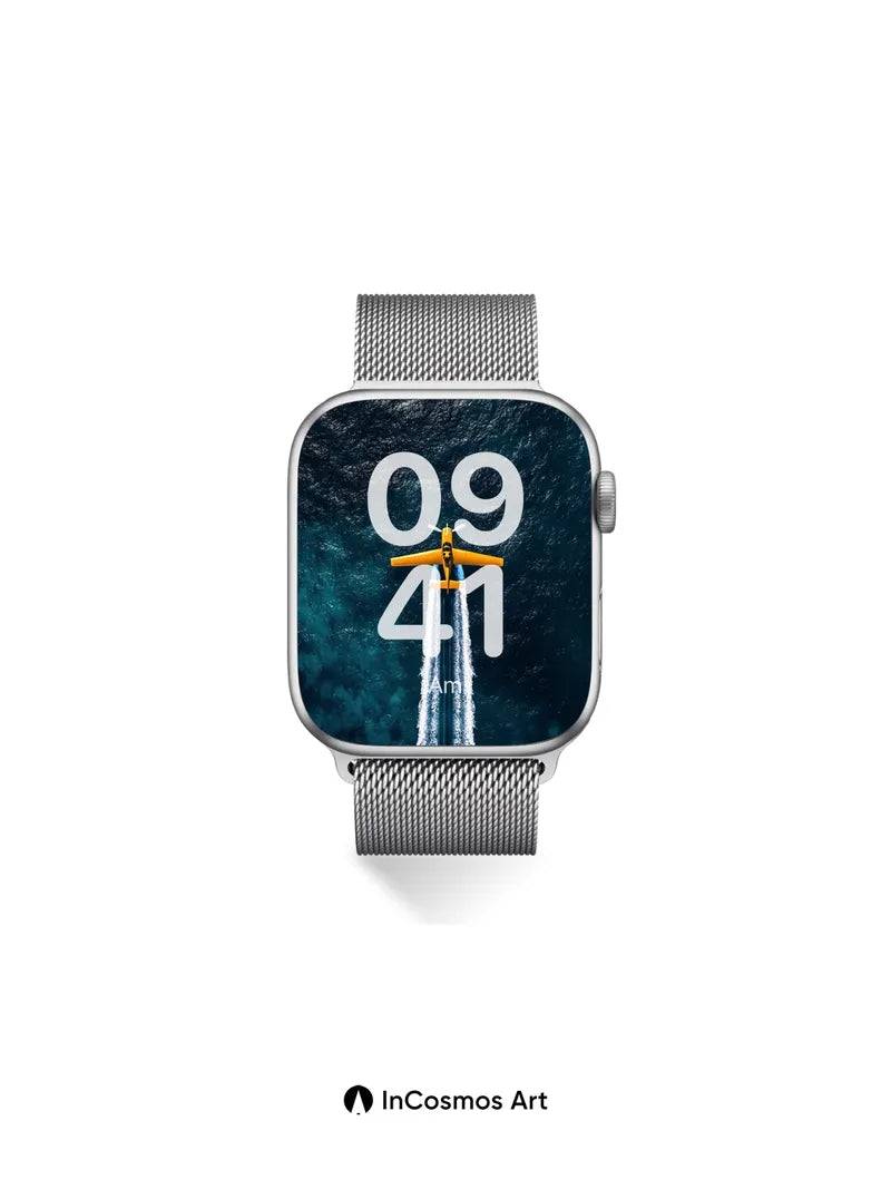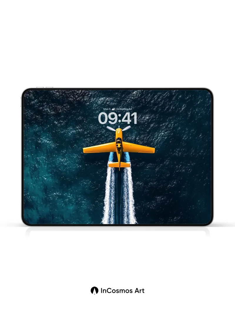 Debug page_description: Did you know seaplanes leave trails that shimmer like liquid silver when viewed from above? This image captures a vibrant yellow aircraft slicing through deep oceanic blues, its wake fracturing the water into cascading ribbons of foam and light. The contrast between the mechanical precision of the plane and the wild texture of the sea evokes a sense of freedom suspended between sky and depth. Share this with your best friend. Send this to your love and swap a matching set. What if every journey left a trail only you could see?