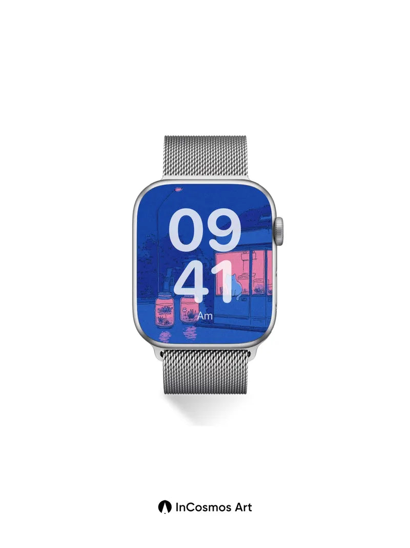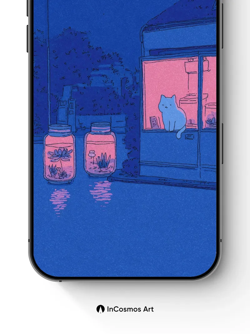 Debug product.metafields.custom.desc: Did you know that the color cobalt blue was once so rare it was worth more than gold? In this quiet night, light crawls over glass jars like slow breaths, their pink glow reflecting in wet pavement as if the street remembers dreams. A cat watches from a glowing window, its silhouette soft against the warmth of a kitchen lit by unseen hands—this is not just a scene, but a moment held between silence and stillness.