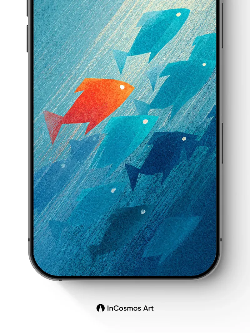 Did you know that fish schools often follow a single leader, creating fluid motion like brushstrokes in water? Here, one orange silhouette breaks the blue tide, its form glowing as if lit from within by sunbeams slicing through deep sea mist. The rest swim in harmony, their shapes softened by streaks of light that crawl across the canvas like underwater constellations.