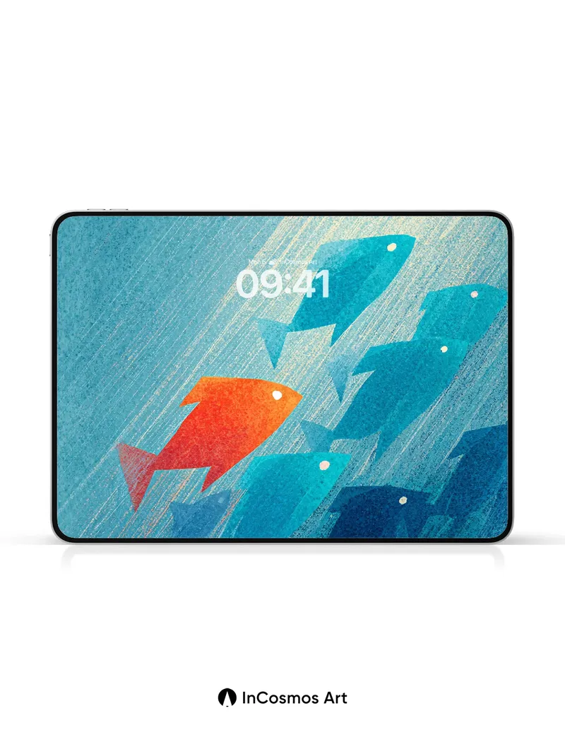 Debug page_description: Did you know that fish schools often follow a single leader, creating fluid motion like brushstrokes in water? Here, one orange silhouette breaks the blue tide, its form glowing as if lit from within by sunbeams slicing through deep sea mist. The rest swim in harmony, their shapes softened by streaks of light that crawl across the canvas like underwater constellations. Share this with your best friend. Send this to your love and swap a matching set. What if your walls could breathe with the ocean’s rhythm?