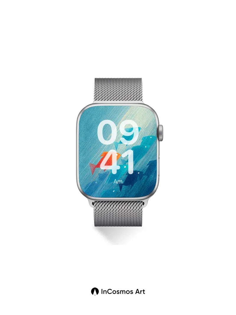 Debug product.metafields.custom.desc: Did you know that fish schools often follow a single leader, creating fluid motion like brushstrokes in water? Here, one orange silhouette breaks the blue tide, its form glowing as if lit from within by sunbeams slicing through deep sea mist. The rest swim in harmony, their shapes softened by streaks of light that crawl across the canvas like underwater constellations.