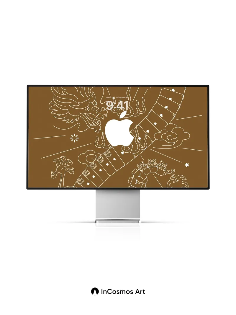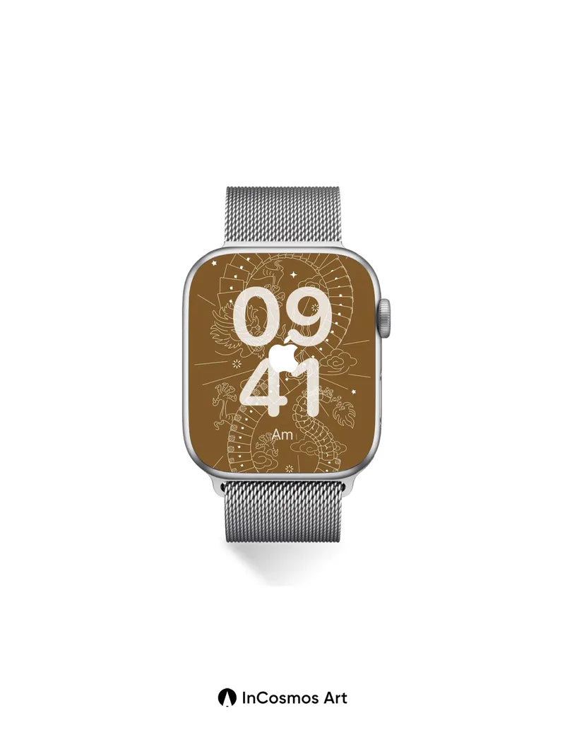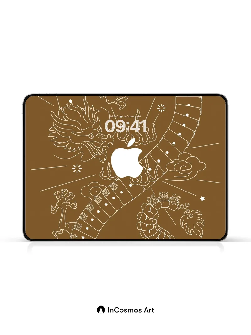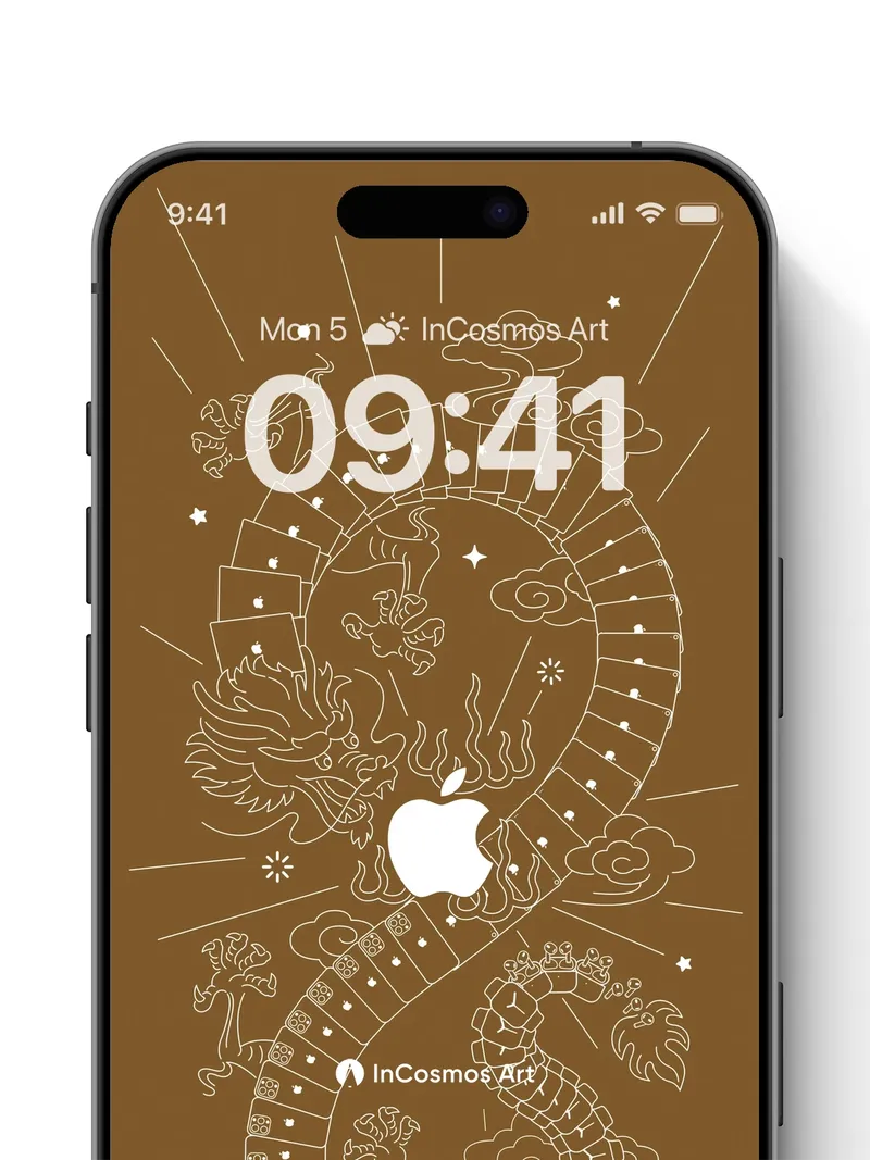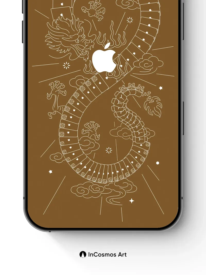 Debug product.metafields.custom.desc: Did you know ancient Chinese myths depicted dragons as celestial beings that shaped the stars? This intricate line drawing breathes life into a serpentine dragon coiled in infinity, its scales formed from stacked iPhone screens glowing with tiny apples, each one a portal to digital dreams. The warm sepia tone feels like aged parchment touched by moonlight, while clouds swirl around the figure like breath in winter air.