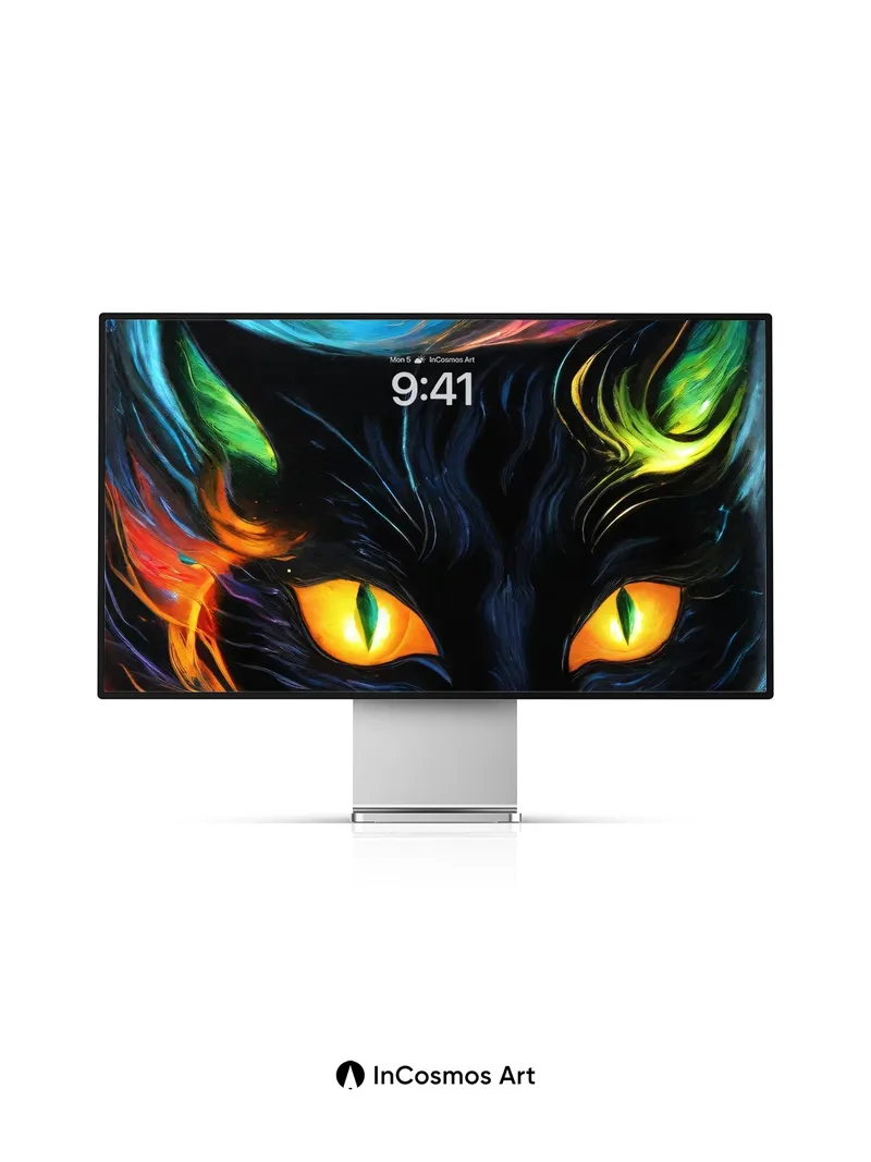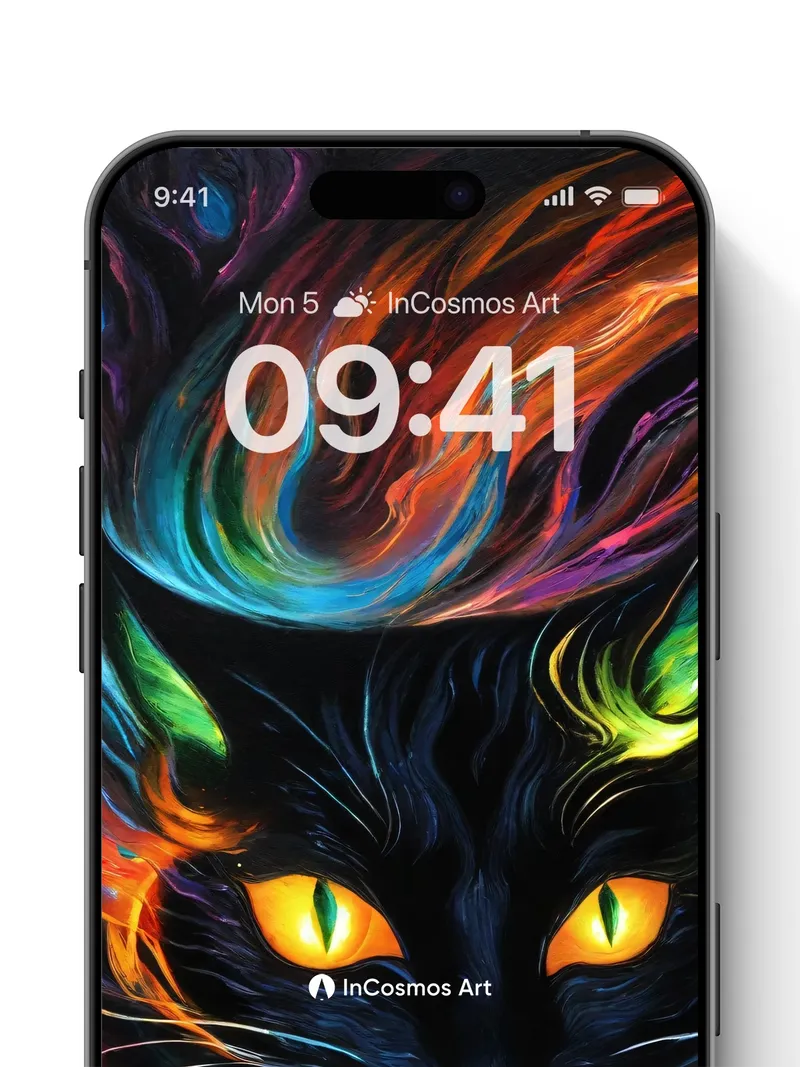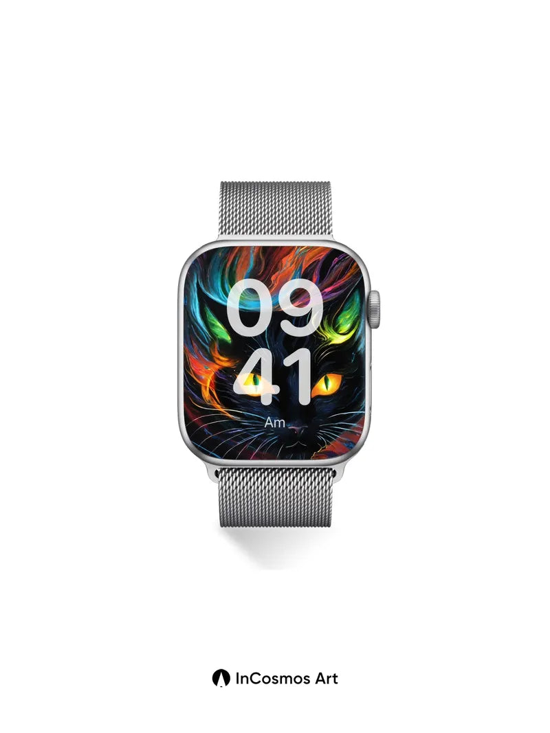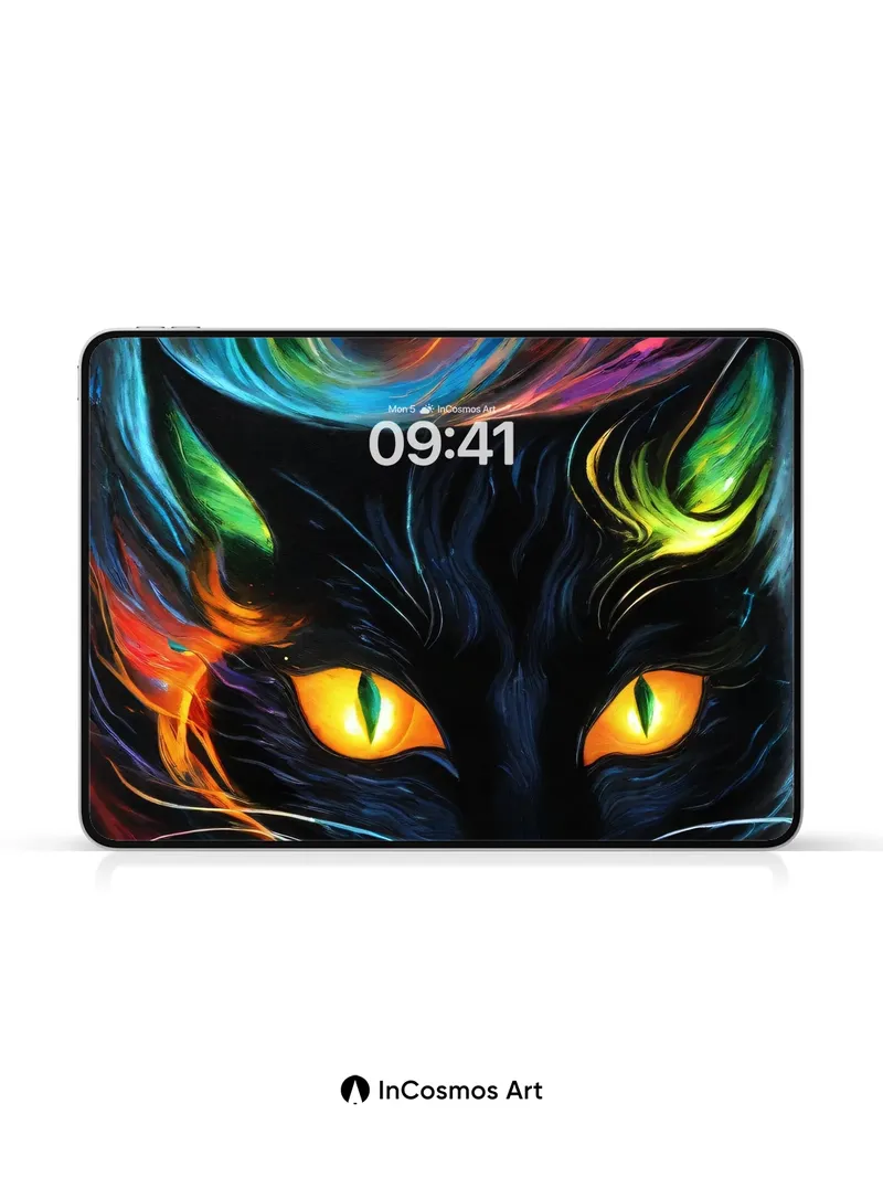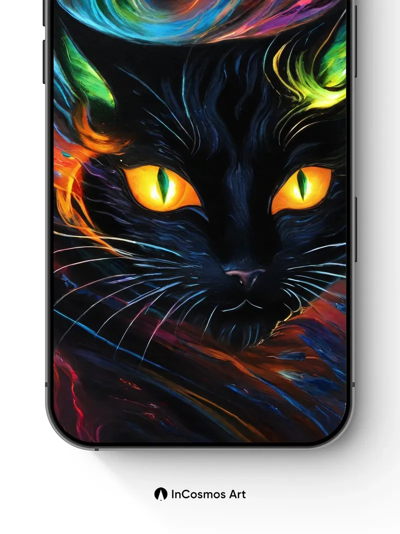 Debug product.metafields.custom.desc: Did you know that cats’ pupils can dilate to absorb light like a prism, revealing hidden spectra in darkness? Here, fire and shadow dance across a feline silhouette, where eyes blaze with molten gold and fur swirls like nebulae forged in stardust. The colors breathe—electric emerald, sapphire, and crimson—wrapping the face in a mythic aura, as if the cat is both predator and portal.