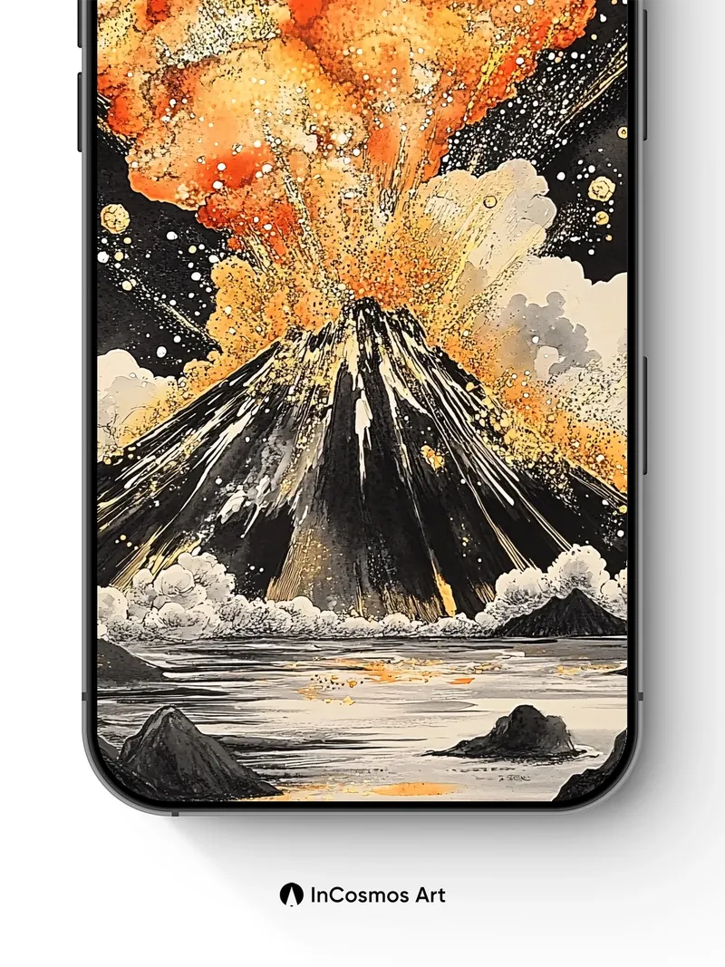 Debug product.metafields.custom.desc: Did you know volcanic eruptions can launch ash into the stratosphere, where it reflects sunlight and paints the sky in surreal hues? Here, molten fire breathes through a mountain’s spine, hurling golden sparks into a night sky scattered with glowing orbs like distant stars. The eruption pulses with life, each ember a tiny sun fleeing gravity, while below, calm waters mirror the chaos as if holding its breath.