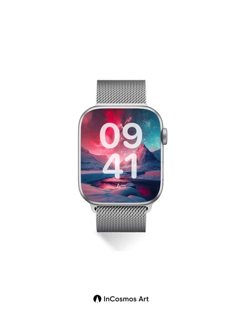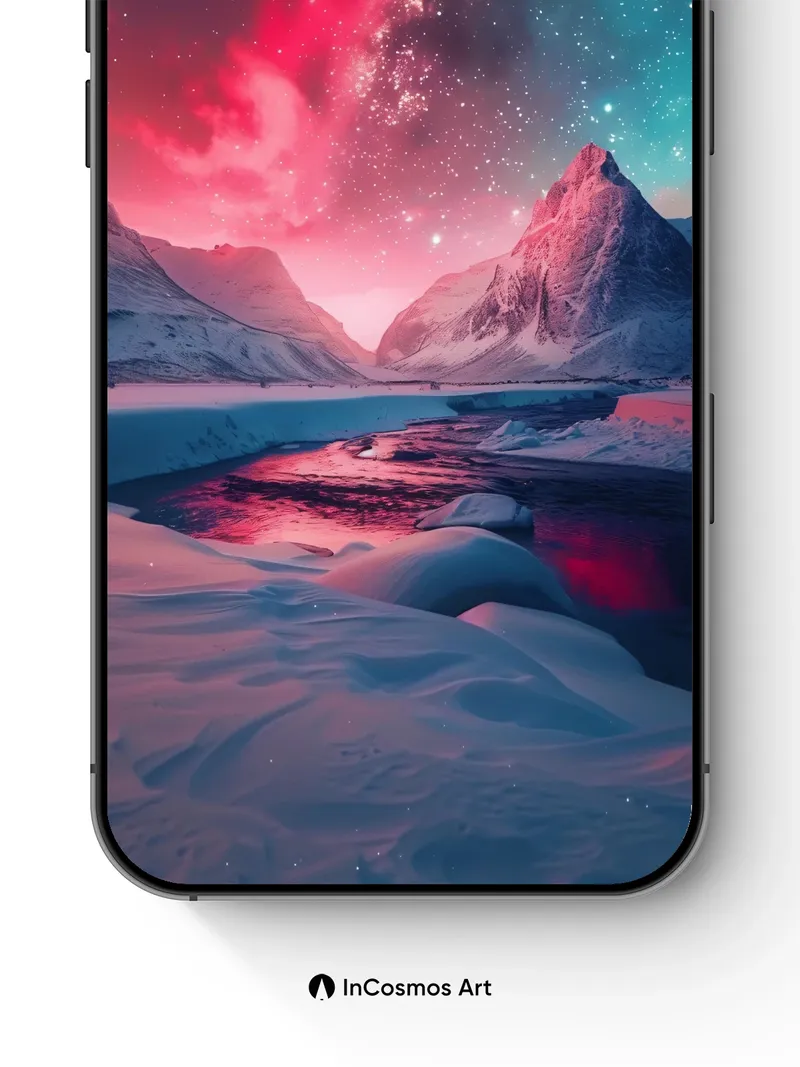 Debug page_description: Did you know the aurora borealis is caused by solar particles colliding with Earth’s atmosphere? Here, crimson light crawls over snow-draped mountains like a living veil, while the river below mirrors the celestial storm in liquid obsidian. The sky breathes in hues of nebula and twilight, casting an otherworldly glow that transforms ice into a cathedral of frozen dreams. Share this with your best friend. Send this to your love and swap a matching set. What if the stars were not distant, but memories waiting to be touched?