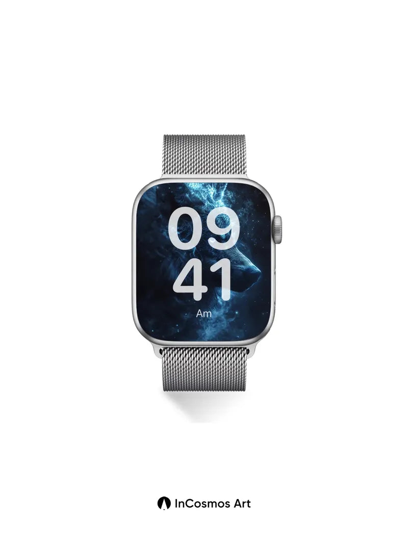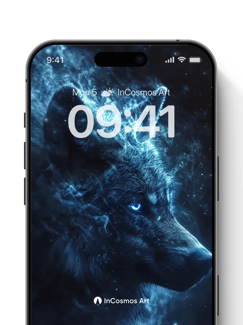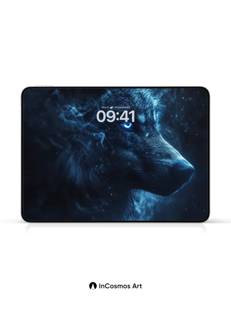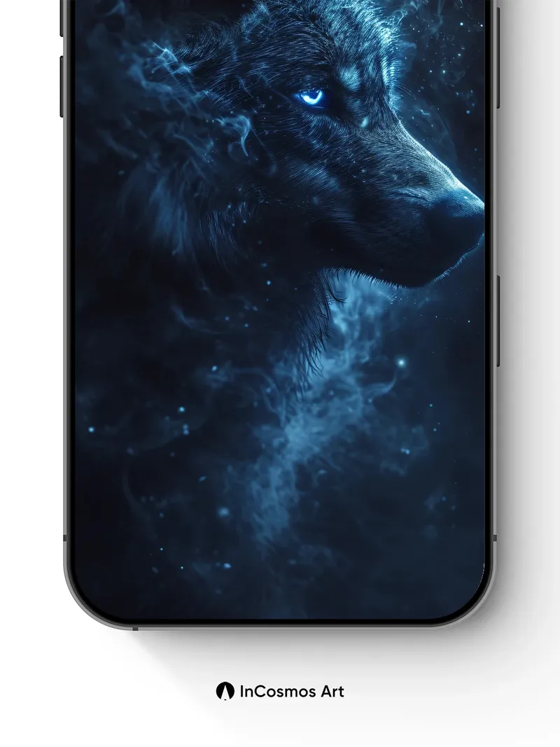 Debug product.metafields.custom.desc: Did you know that wolves can communicate over distances of up to 10 miles through their howls? This digital portrait captures the silhouette of a wolf emerging from nebula-like smoke, its fur threaded with electric blue light that pulses like distant stars. The glow crawls across its face like frost forming on glass, revealing eyes that hold galaxies within them. You feel the chill of space and the warmth of ancient instinct colliding in one breath.