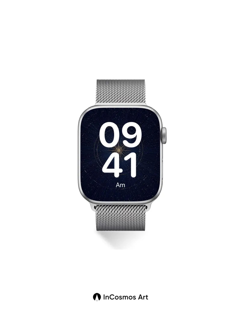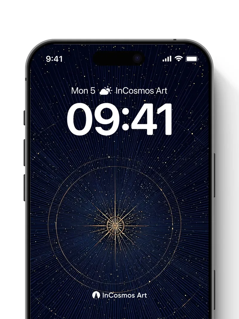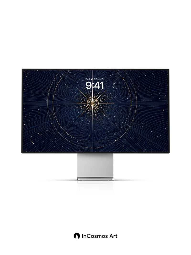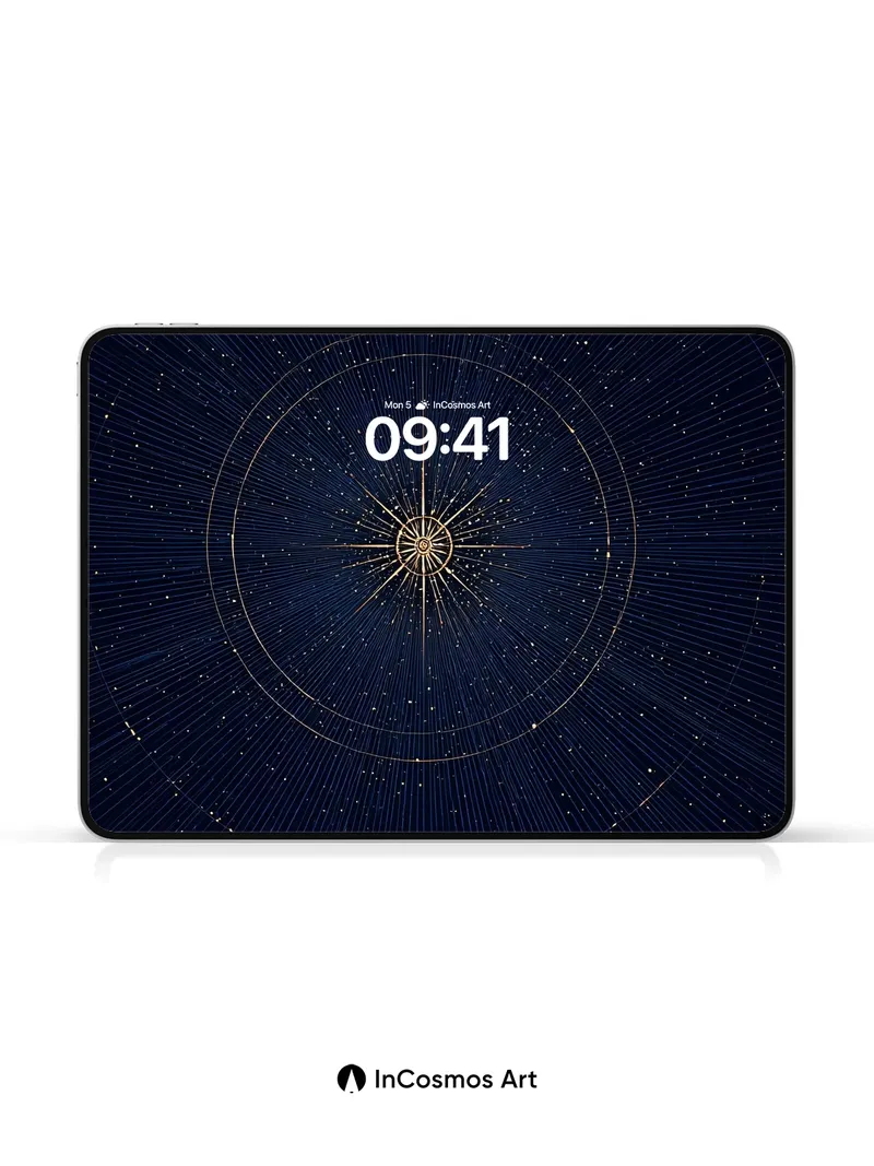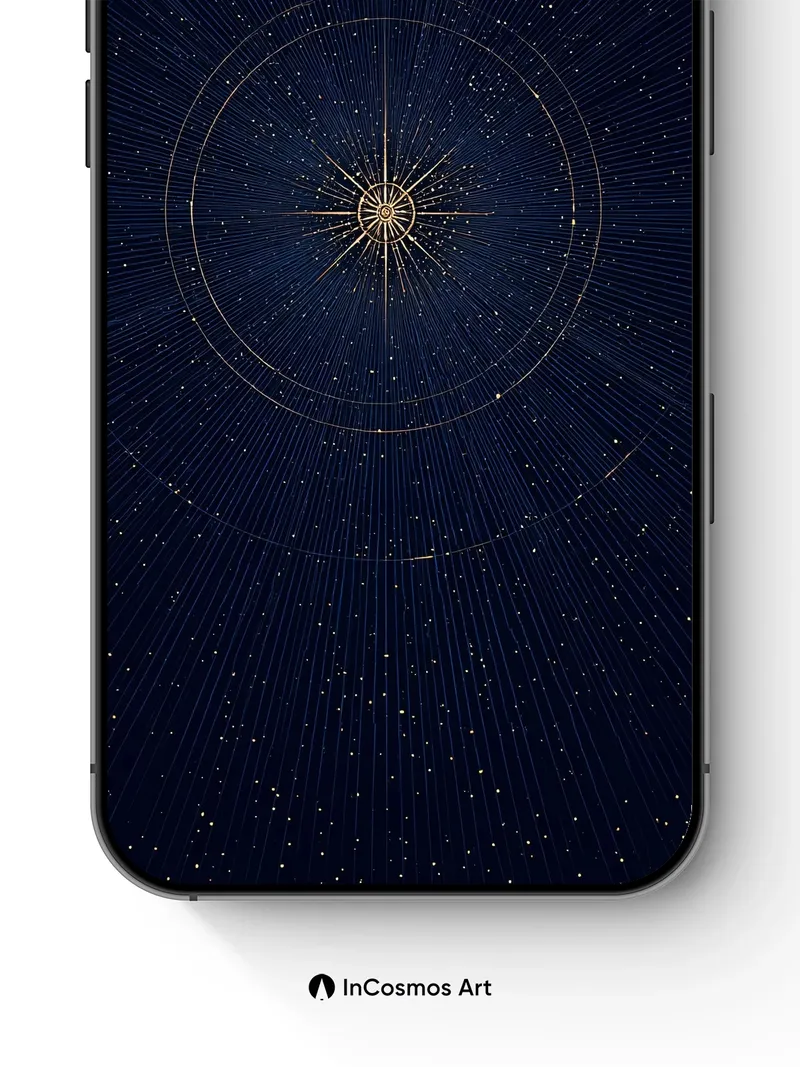 Debug product.metafields.custom.desc: Did you know ancient astronomers mapped the stars using concentric circles and radial lines? This design breathes that same celestial geometry into a modern night sky, where golden filaments stretch like threads of light across a deep indigo void. Each tiny star is a point of quiet resistance against the infinite dark, pulsing with a stillness that feels both ancient and eternal.