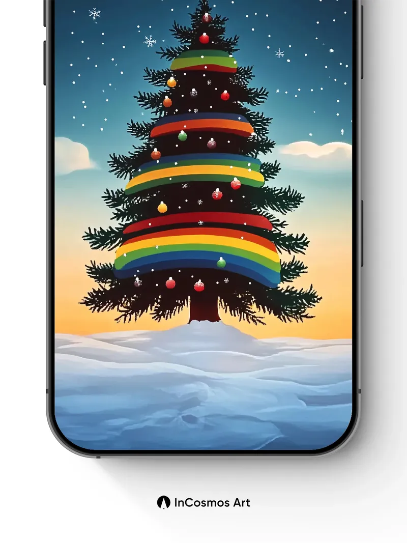 Did you know the first electric Christmas tree was lit in 1895, sparking a holiday revolution? This festive pine glows with rainbow ribbons that ripple like liquid light, crowned by a golden star pulsing against a velvet night scattered with snowflake constellations. The air hums with quiet magic as frost-kissed branches cradle glowing baubles, each one a tiny universe reflecting the twilight’s soft gradient from amber to indigo.
