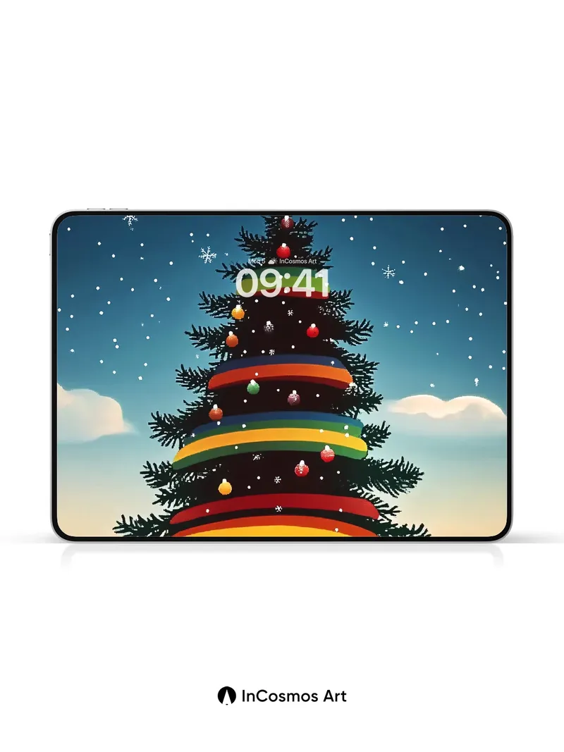 Debug page_description: Did you know the first electric Christmas tree was lit in 1895, sparking a holiday revolution? This festive pine glows with rainbow ribbons that ripple like liquid light, crowned by a golden star pulsing against a velvet night scattered with snowflake constellations. The air hums with quiet magic as frost-kissed branches cradle glowing baubles, each one a tiny universe reflecting the twilight’s soft gradient from amber to indigo. Share this with your best friend. Send this to your love and swap a matching set. What if every snowflake held a memory of winter?