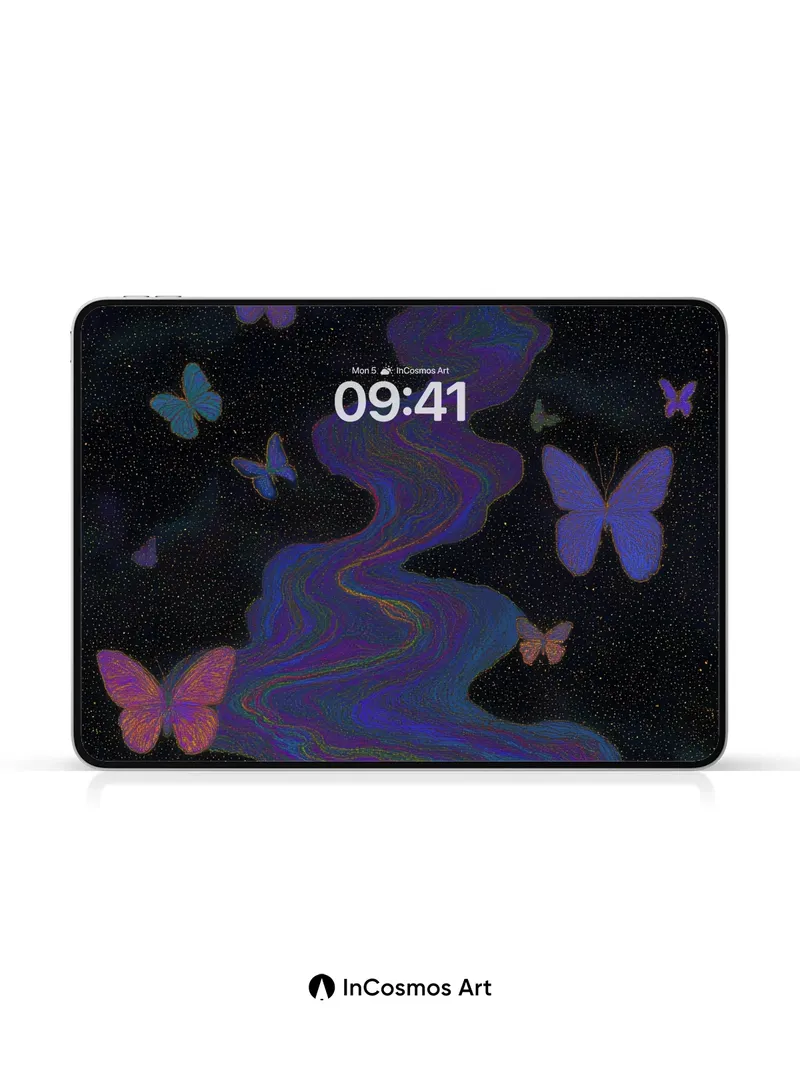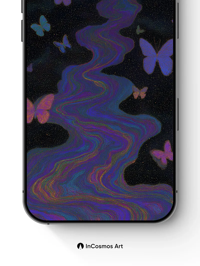Debug page_description: Did you know that butterflies can detect ultraviolet light, making them navigate by celestial patterns? Here, they drift through a galaxy-streaked void where color breathes like liquid auroras—each wingbeat stirring the nebula’s slow pulse. The river of iridescent flow isn’t water, but memory made visible, winding through star-dusted silence as if time itself were folding into dream. Share this with your best friend. Send this to your love and swap a matching set. What if your dreams left trails behind?