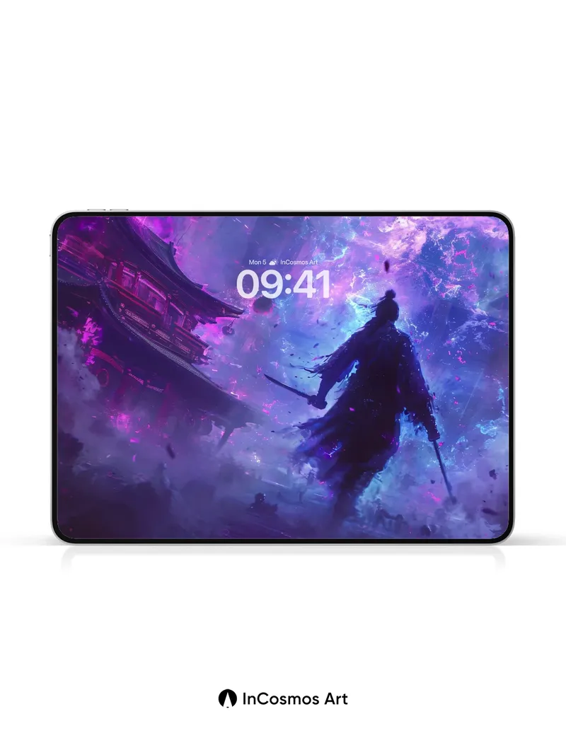 Debug product.metafields.custom.desc: Did you know ancient Japanese legends speak of warriors who fought beneath celestial storms? Here, a lone figure stands silhouetted against a sky alive with violet nebulae and drifting cherry petals, their sword drawn as if to part the heavens themselves. The temple looms like a ghost from another dimension, its eaves brushing clouds that pulse with inner light.