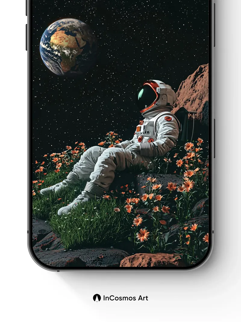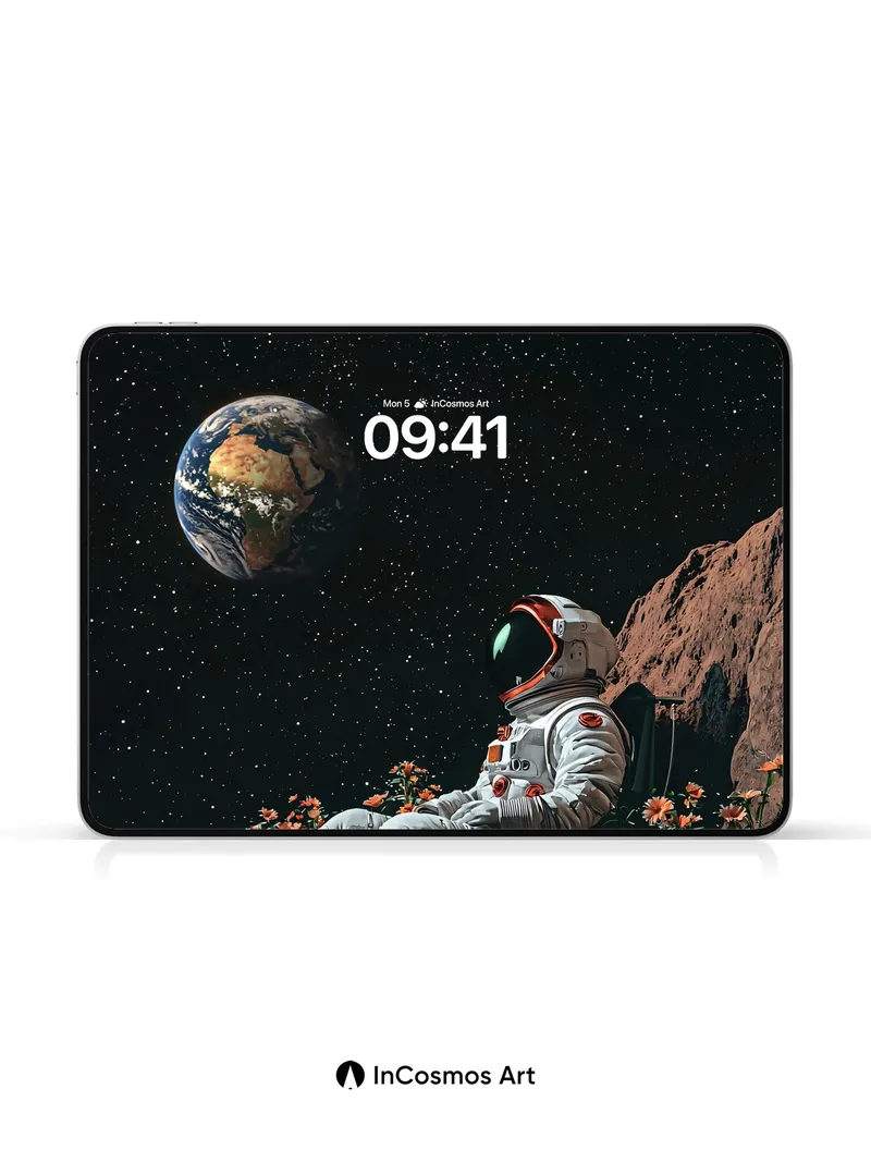 Debug product.metafields.custom.desc: Did you know that astronauts report seeing Earth as a fragile, luminous sphere from space—a sight so profound it’s called the Overview Effect? Here, in silence beneath a velvet sky speckled with stars, an astronaut rests among wildflowers blooming on alien soil, gazing at our blue world like a distant memory. The contrast of rust-red rock and soft petals against the infinite dark makes time feel still, yet alive.