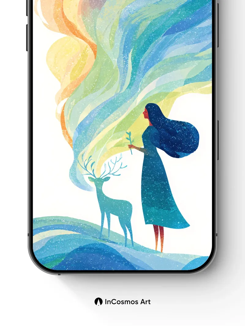 Debug product.metafields.custom.desc: Did you know that the color gradients in this artwork mimic the aurora borealis seen from the Arctic Circle? A woman stands at the edge of a dreamlike landscape, her silhouette glowing against swirling ribbons of light that breathe like living currents—each stroke a whisper of wind and stardust. Beside her, a deer watches as the sky unfurls into a galaxy of motion, where color dances like fireflies trapped in liquid glass.