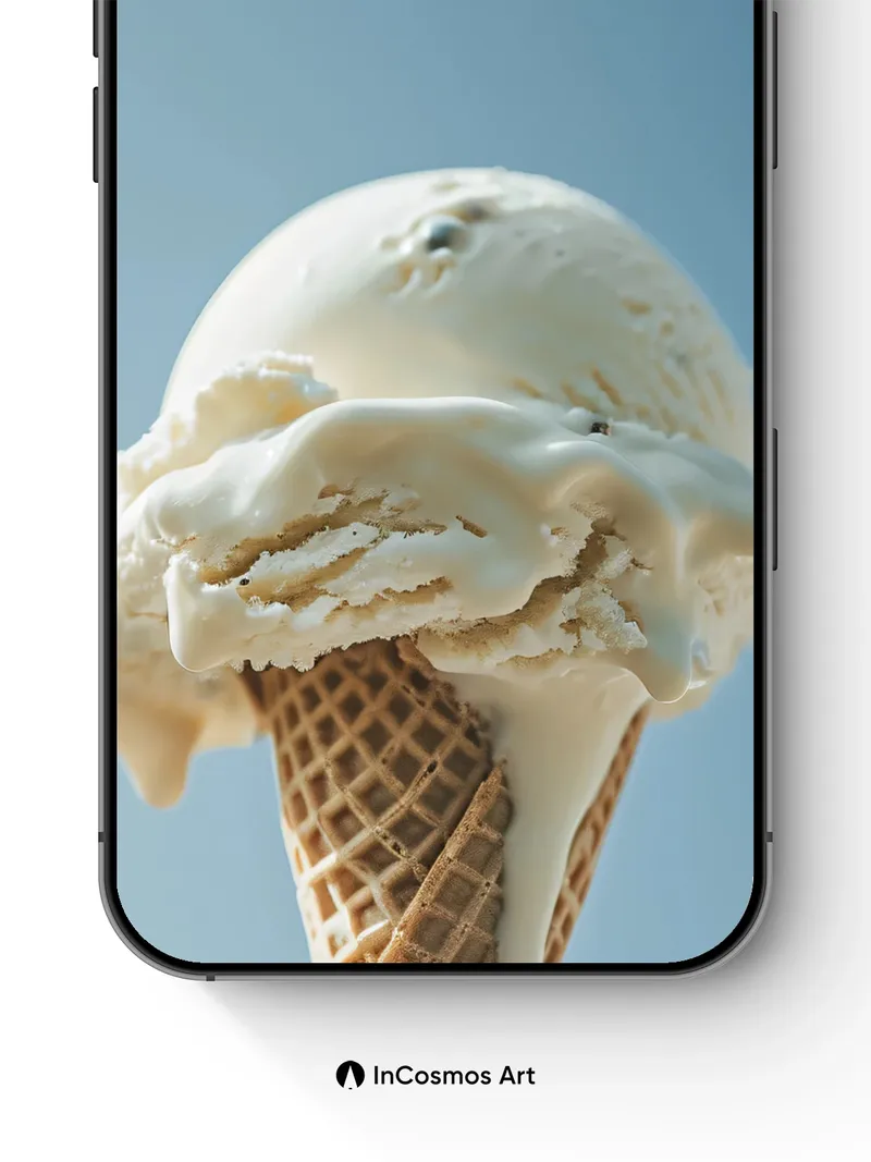 Debug page_description: Did you know vanilla ice cream was first recorded in 17th-century France, where it was served in delicate sugar cones? Here, a single scoop unravels like time itself—its surface softening under the sun’s breath, edges curling into lace-like folds as it slips down the waffle grid. The sky behind it is not just blue but a hush, holding the moment between cold and warmth. Share this with your best friend. Send this to your love and swap a matching set. What if every memory tasted like melting ice cream?